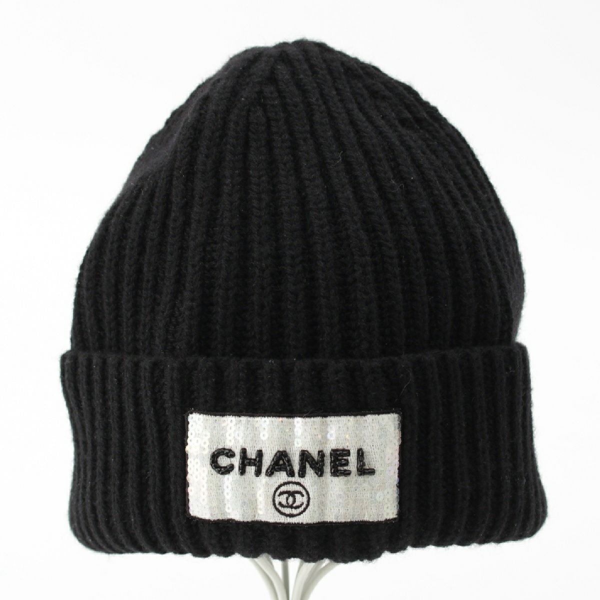 シャネル 23AW ロゴ ココマーク スパンコール ニットキャップ ビーニー 帽子 ブラック
