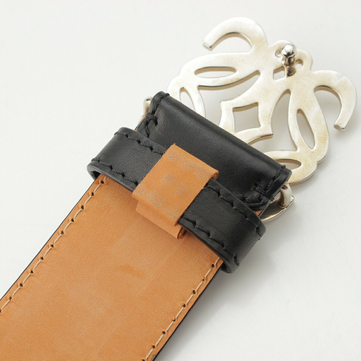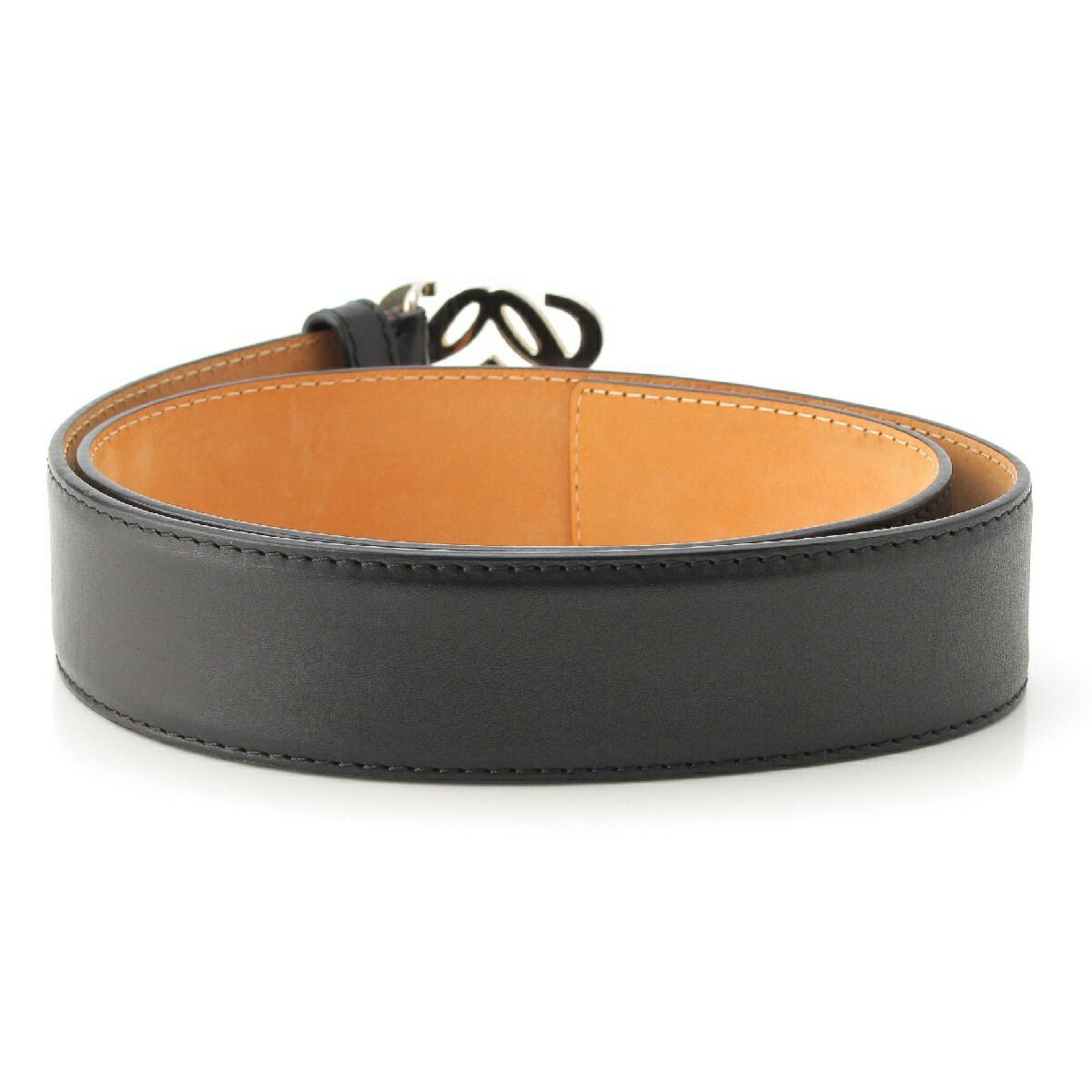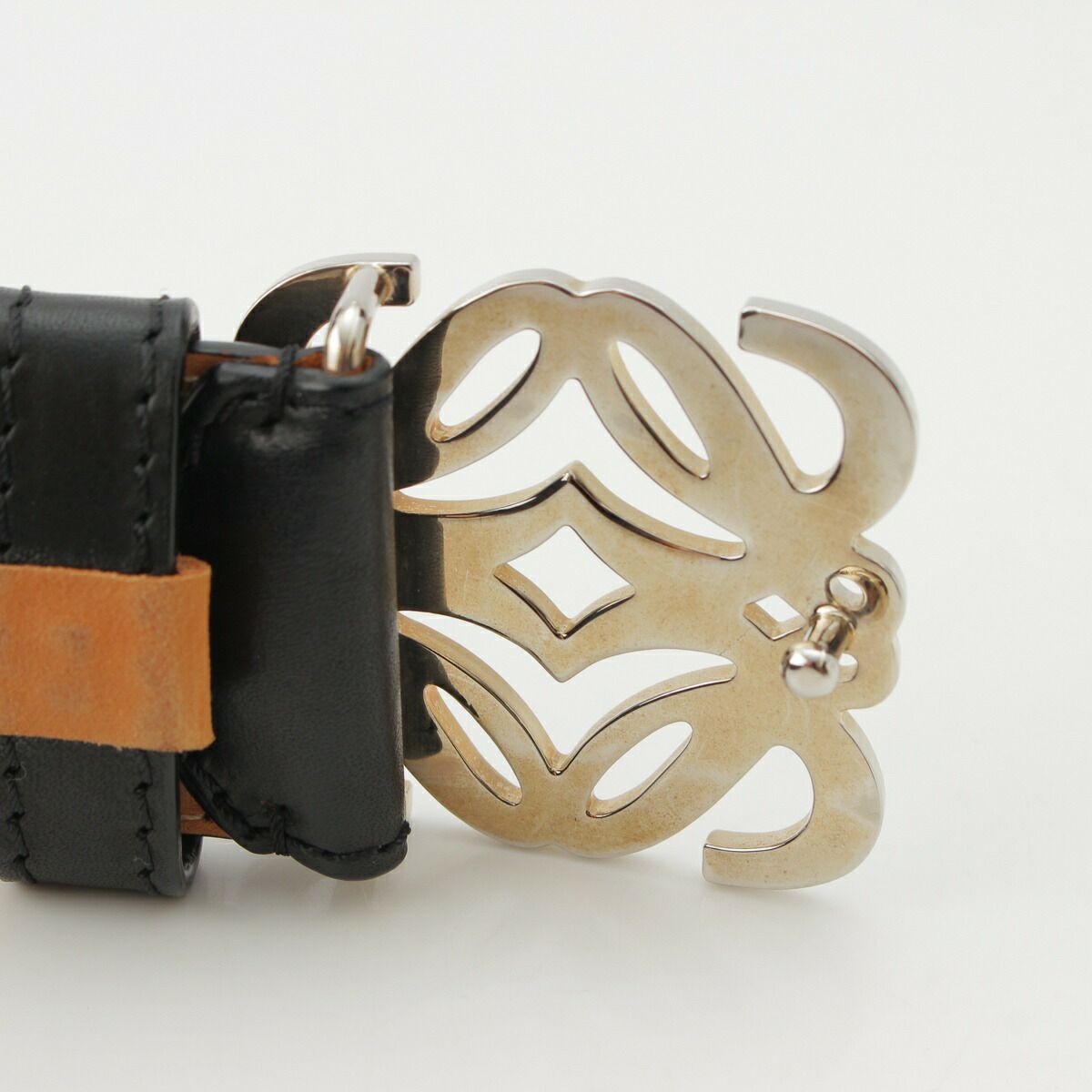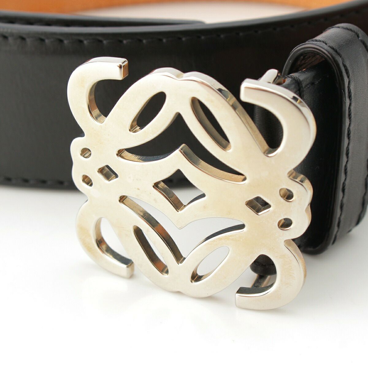 ロエベ アナグラム ロゴ レザー ベルト 小物 シルバー金具 ブラック ベージュ シルバー 34-55【中古】【正規品保証】