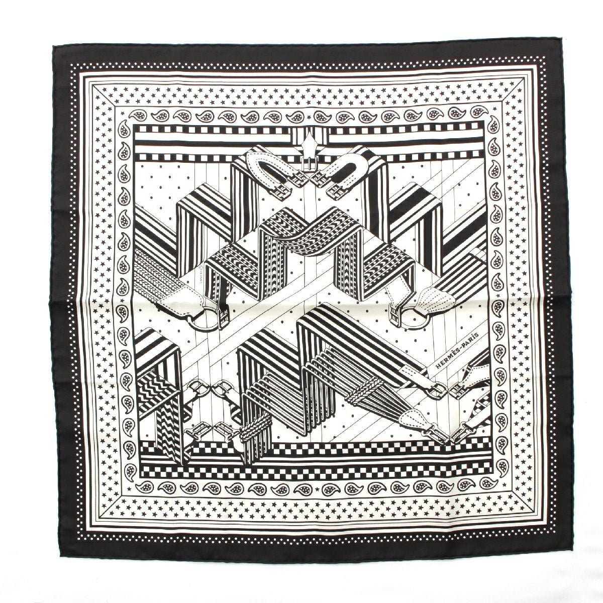 エルメス バンダナ 55 シルク SANGLES EN ZIGZAG ジグザグのサングル スカーフ ブラック×ホワイト