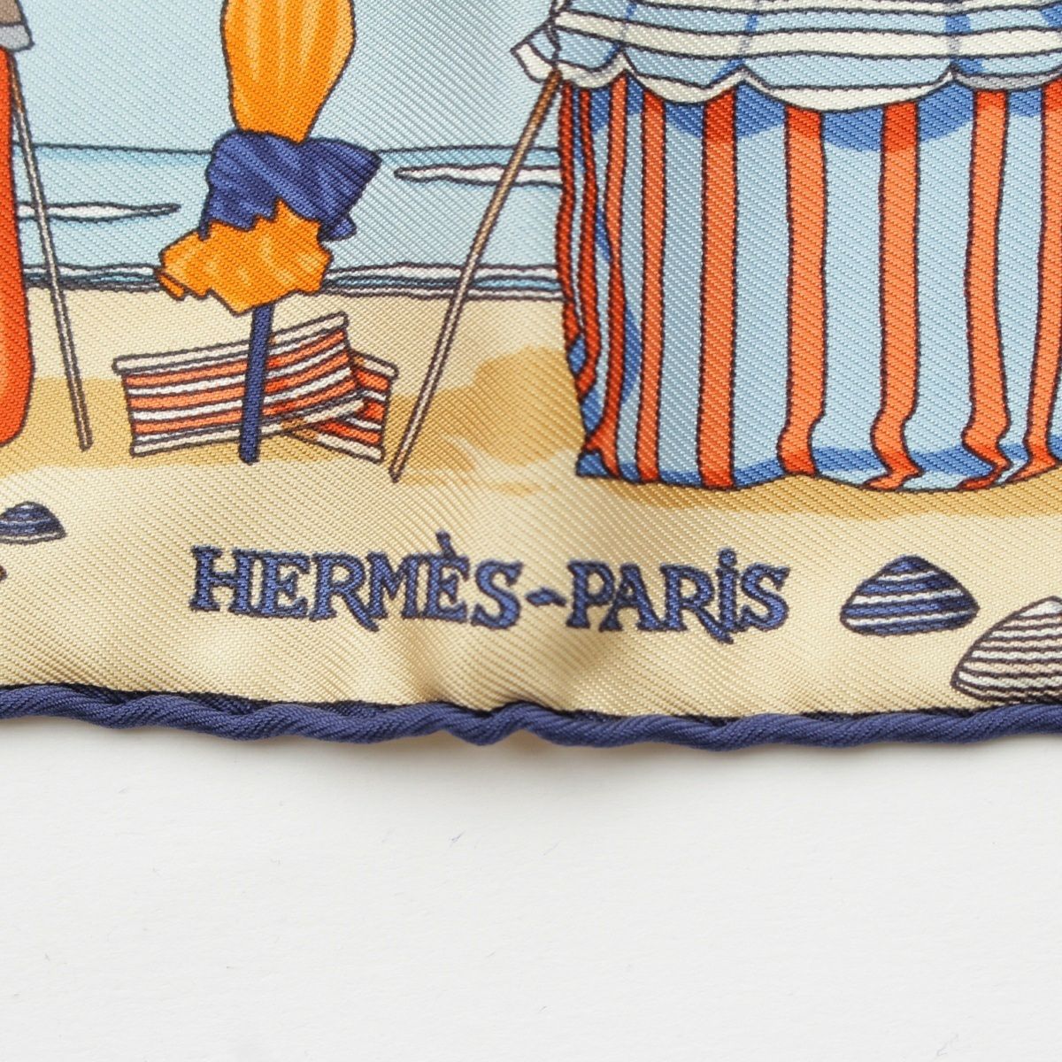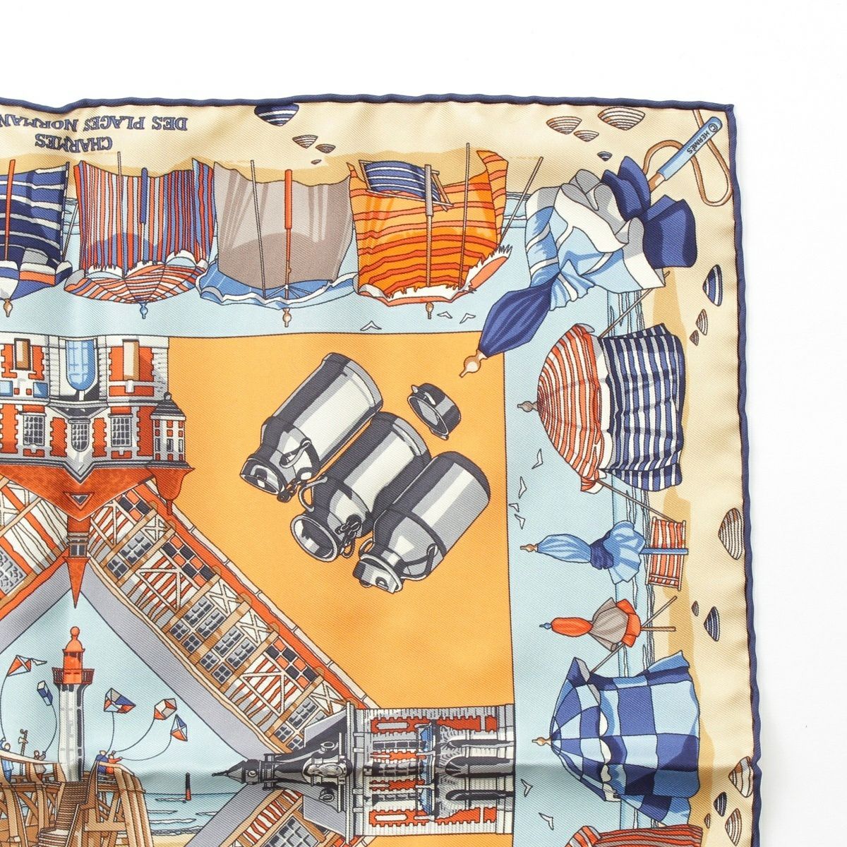 エルメス カレ45 CHARMES DES PLAGES NORMANDES ノルマンディー海岸の魅力 シルク スカーフ 海 船 浜辺 オレンジ ブルー