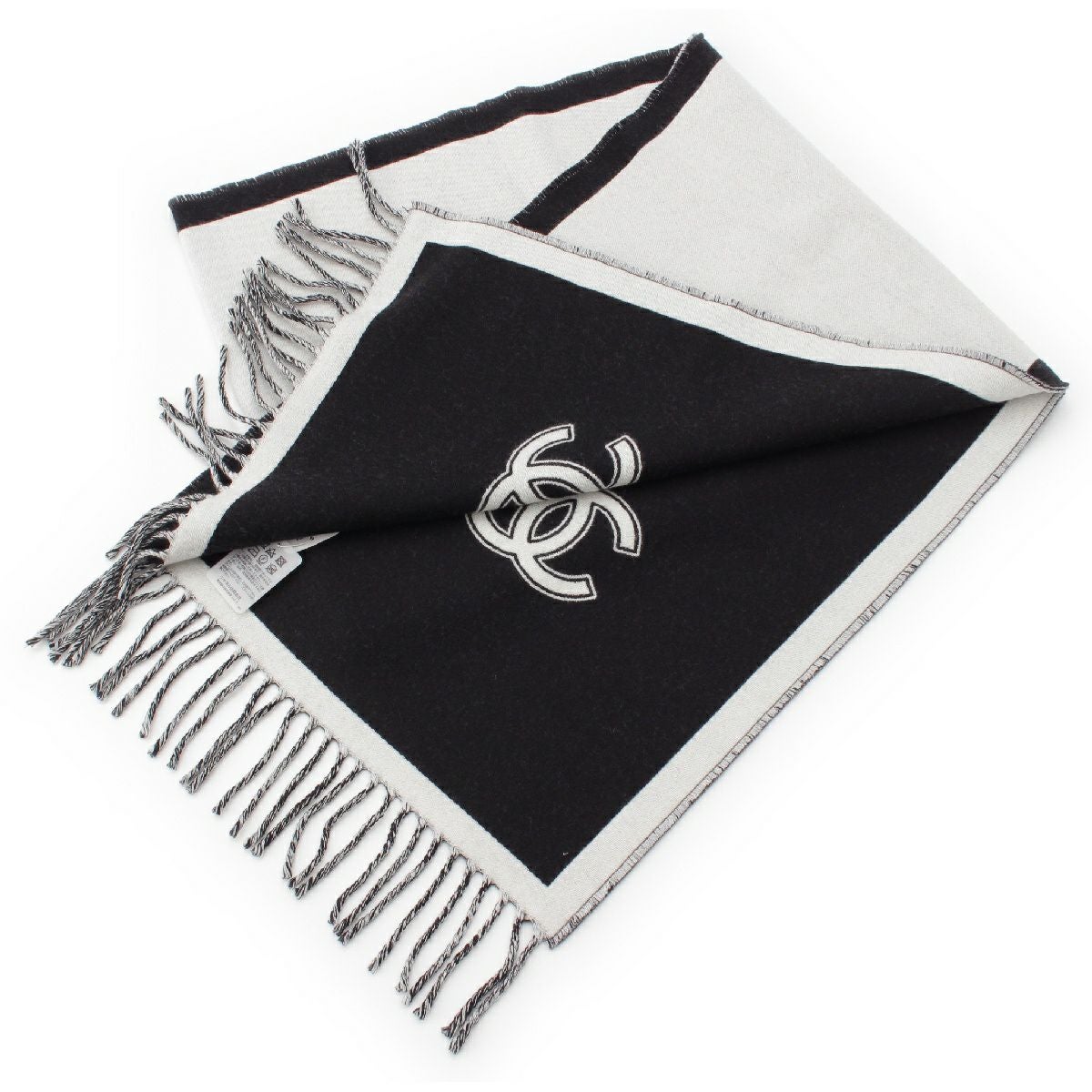 シャネル 24AW ウール ココマーク フリンジ マフラー ストール ブラック×グレー