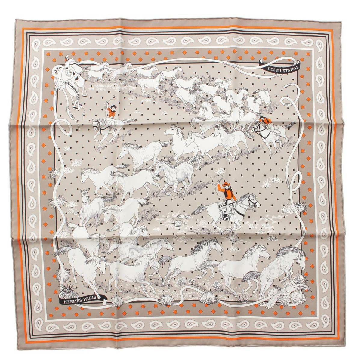 エルメス カレ55 シルク スカーフ Les Mustangs Bandana 野生馬 オレンジ ×グレー