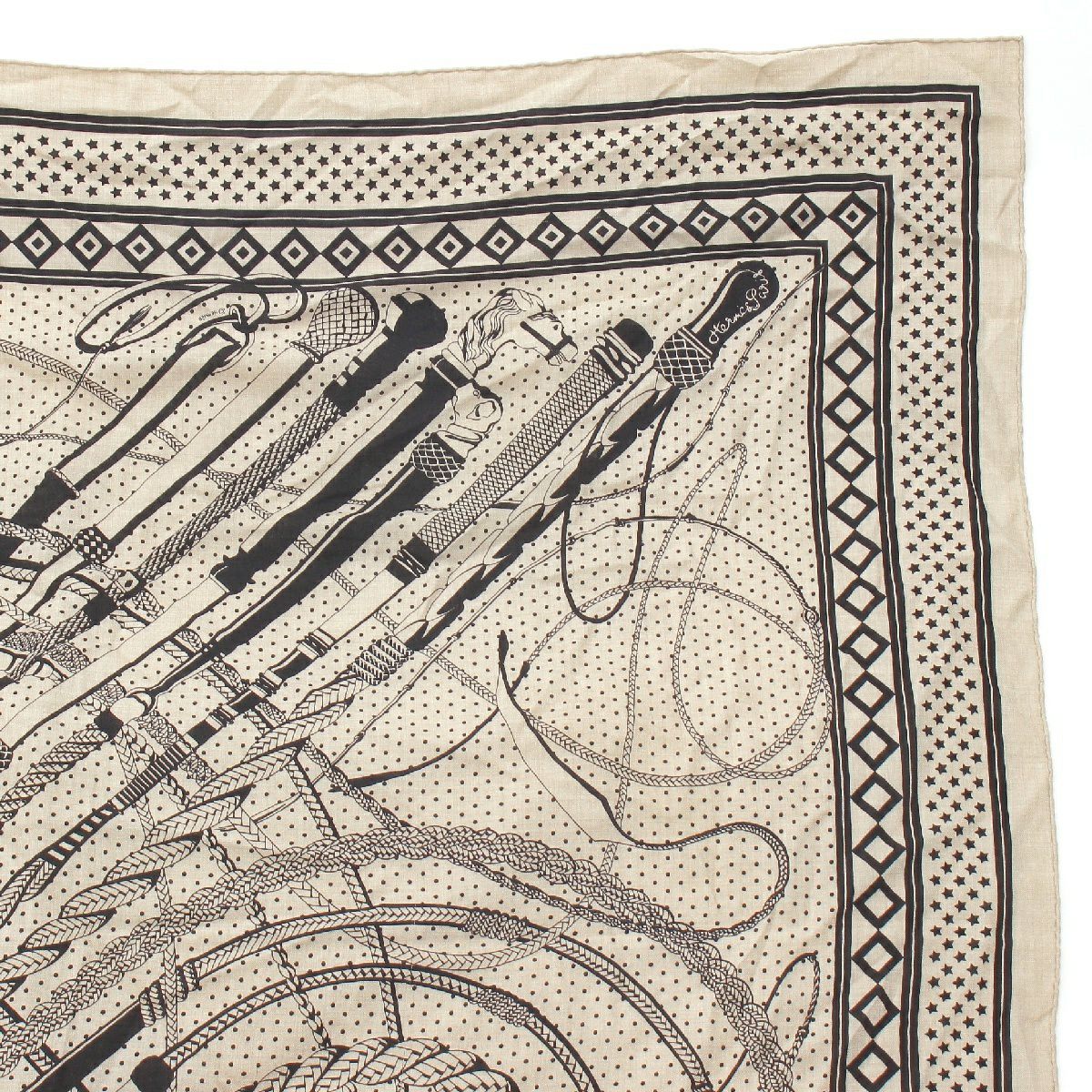 エルメス カレジェアン140 カシミヤ シルク Fouets et Badines Bandana 鞭とグリップ ストール 大判スカーフ ベージュ ブラック マルチカラー