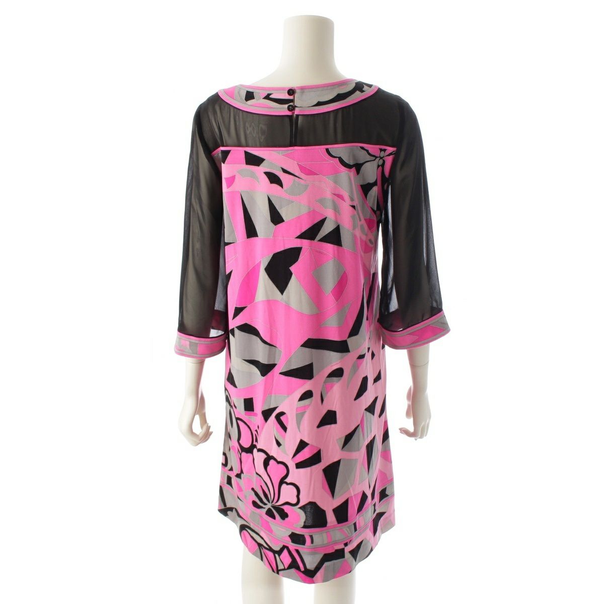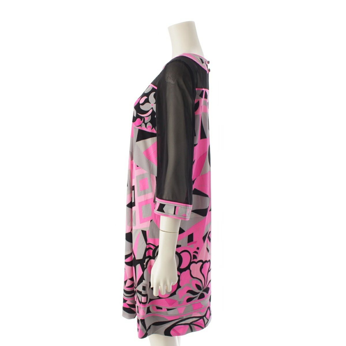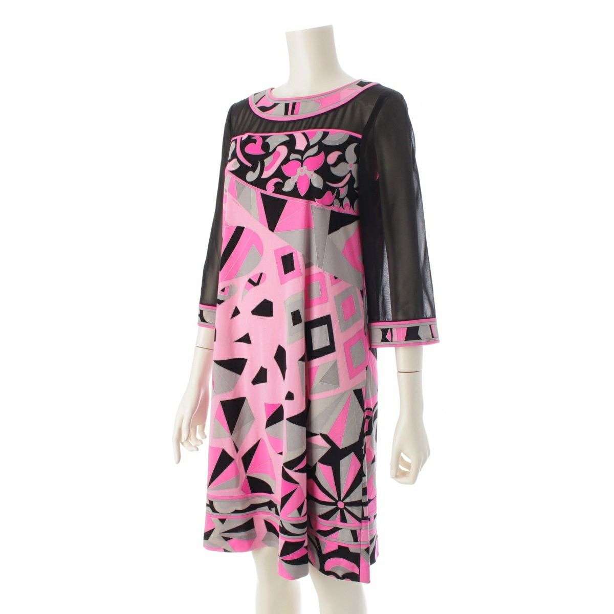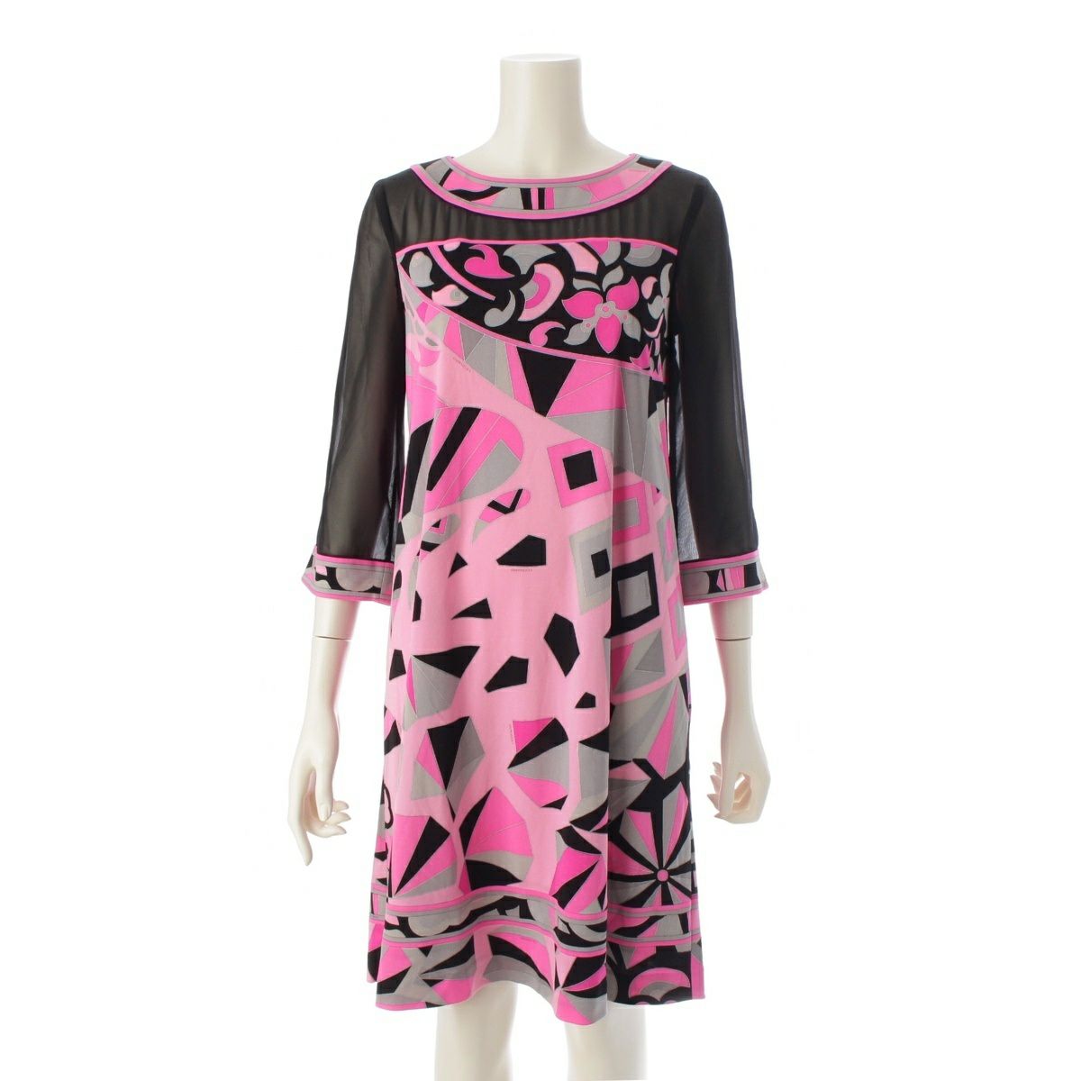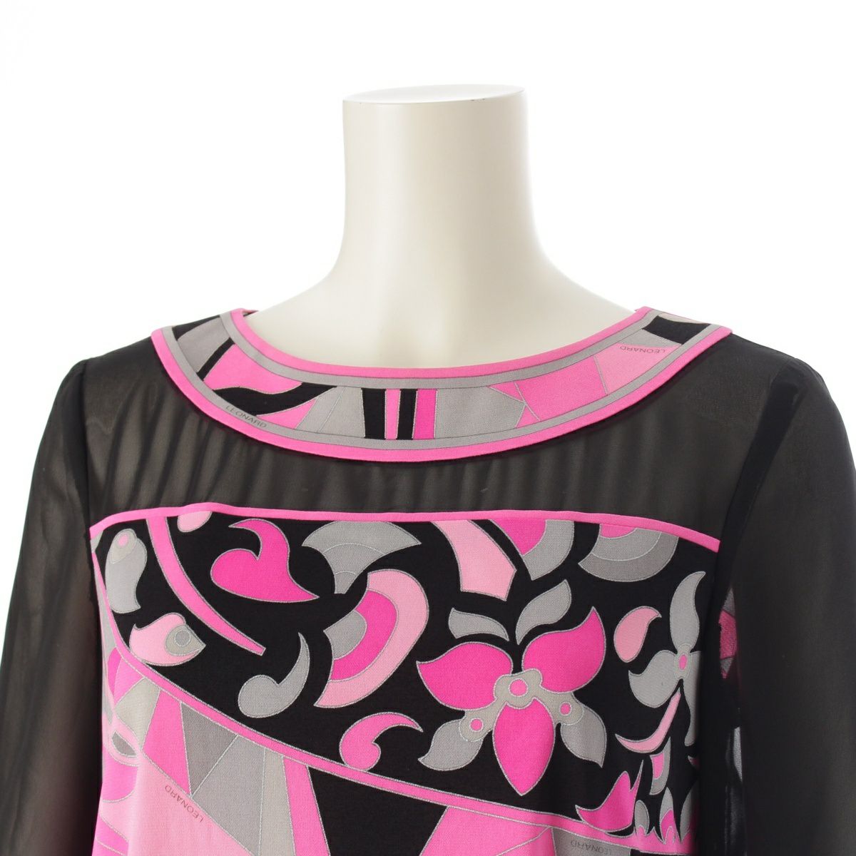 レオナール カンカン シースルー 切替 総柄 ワンピース ドレス 0160224 ピンク ブラック 36