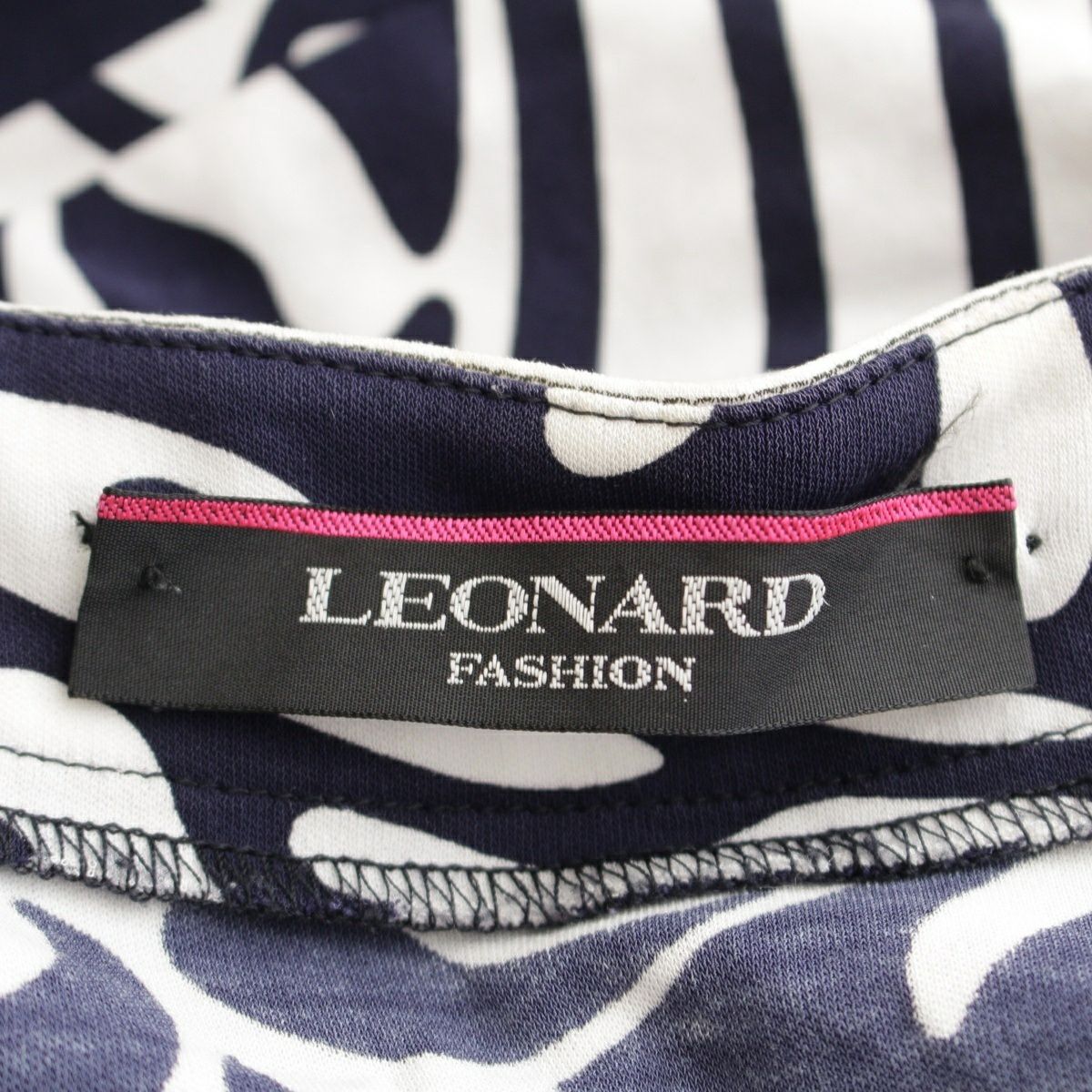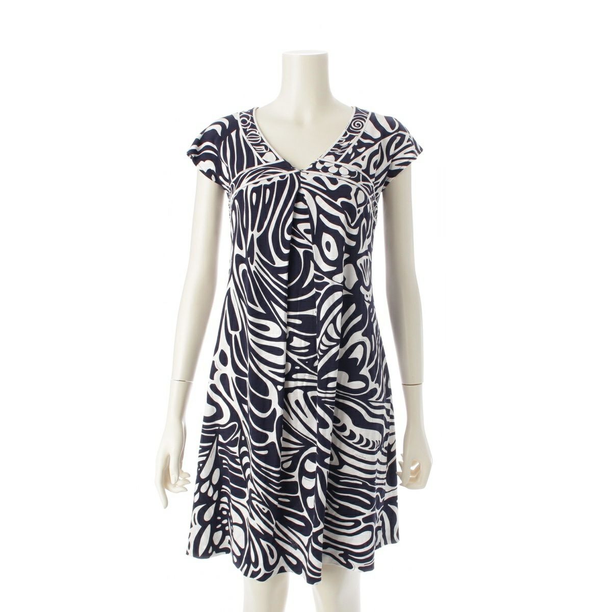 レオナール コットン 総柄 タック フレンチスリーブ ワンピース ドレス 0330801 ネイビー ホワイト 36