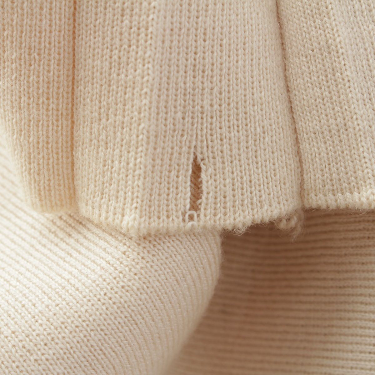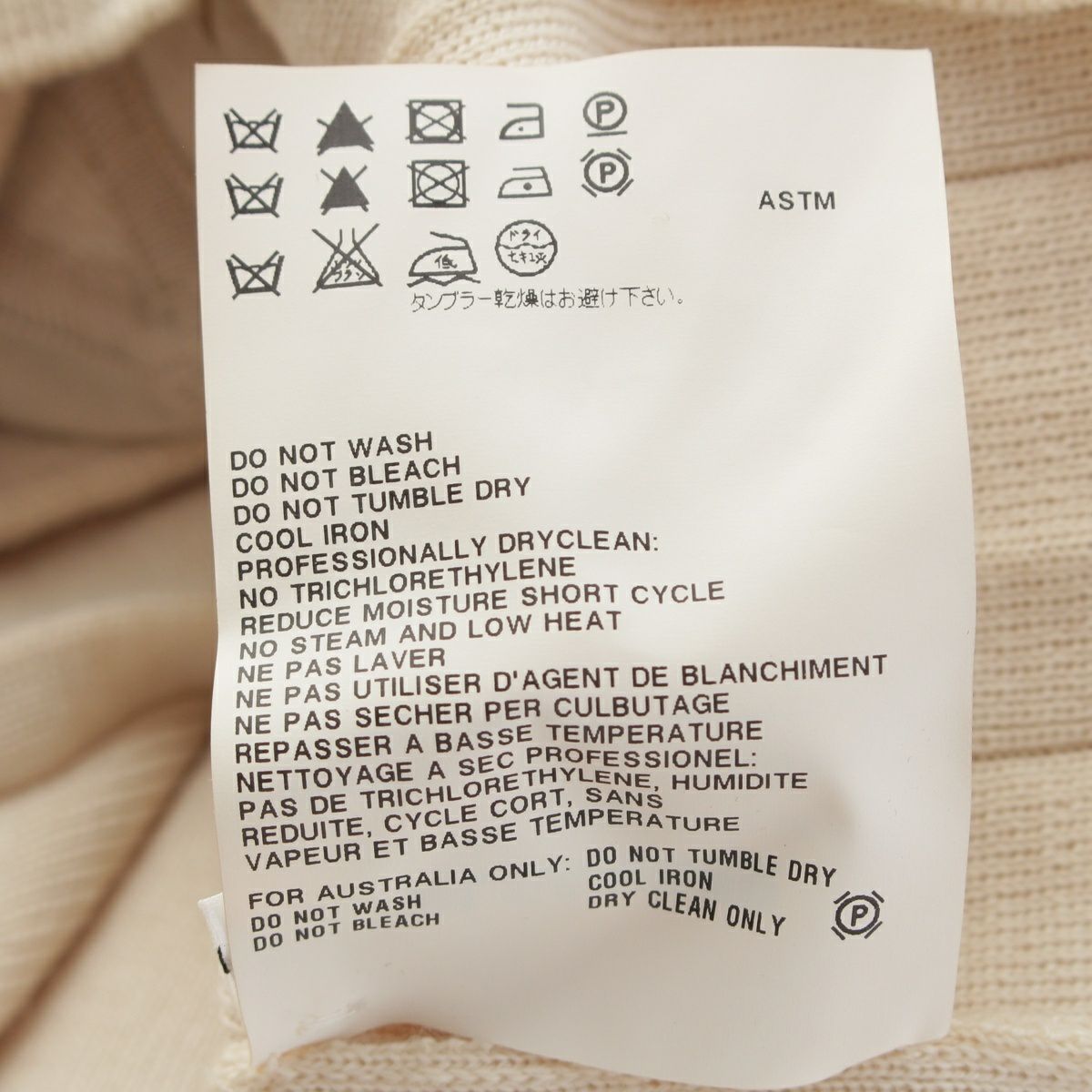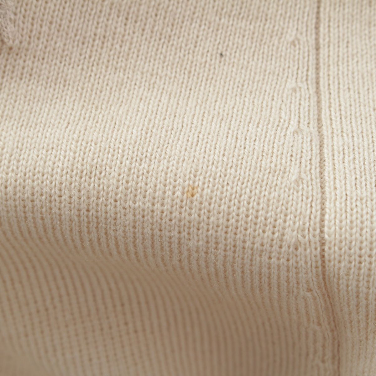 ダメージ箇所: 前側にシミ/糸つれ/穴あき、後ろ側にシミ/糸つれ、内側に毛玉、タグに汚れ、
