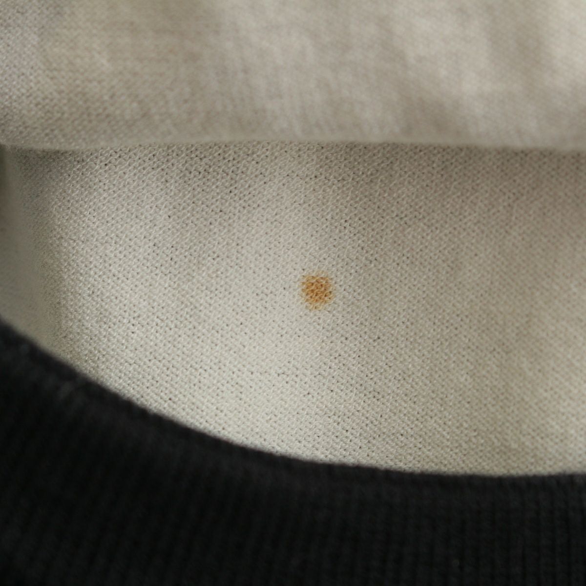 ダメージ箇所: 首回り、右肩に汚れ、表面(裏地)胸あたりにシミ、