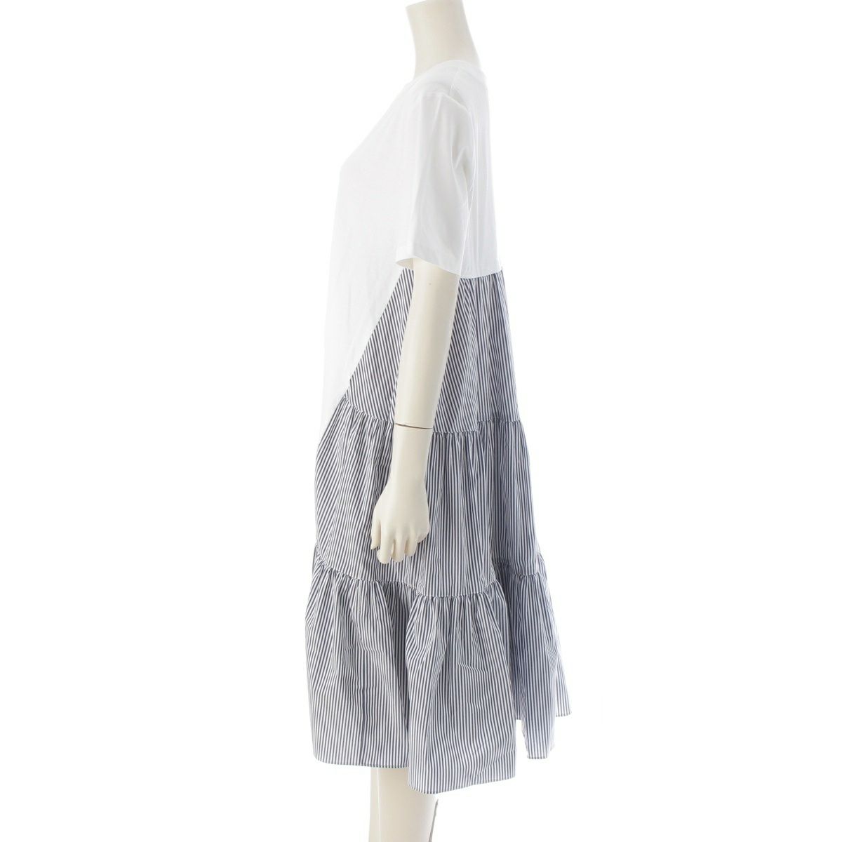 アディアム 25年 コットン Greta グレタ 異素材 ドッキング ストライプ ティアード ワンピース 45550 ホワイト ブルー 4