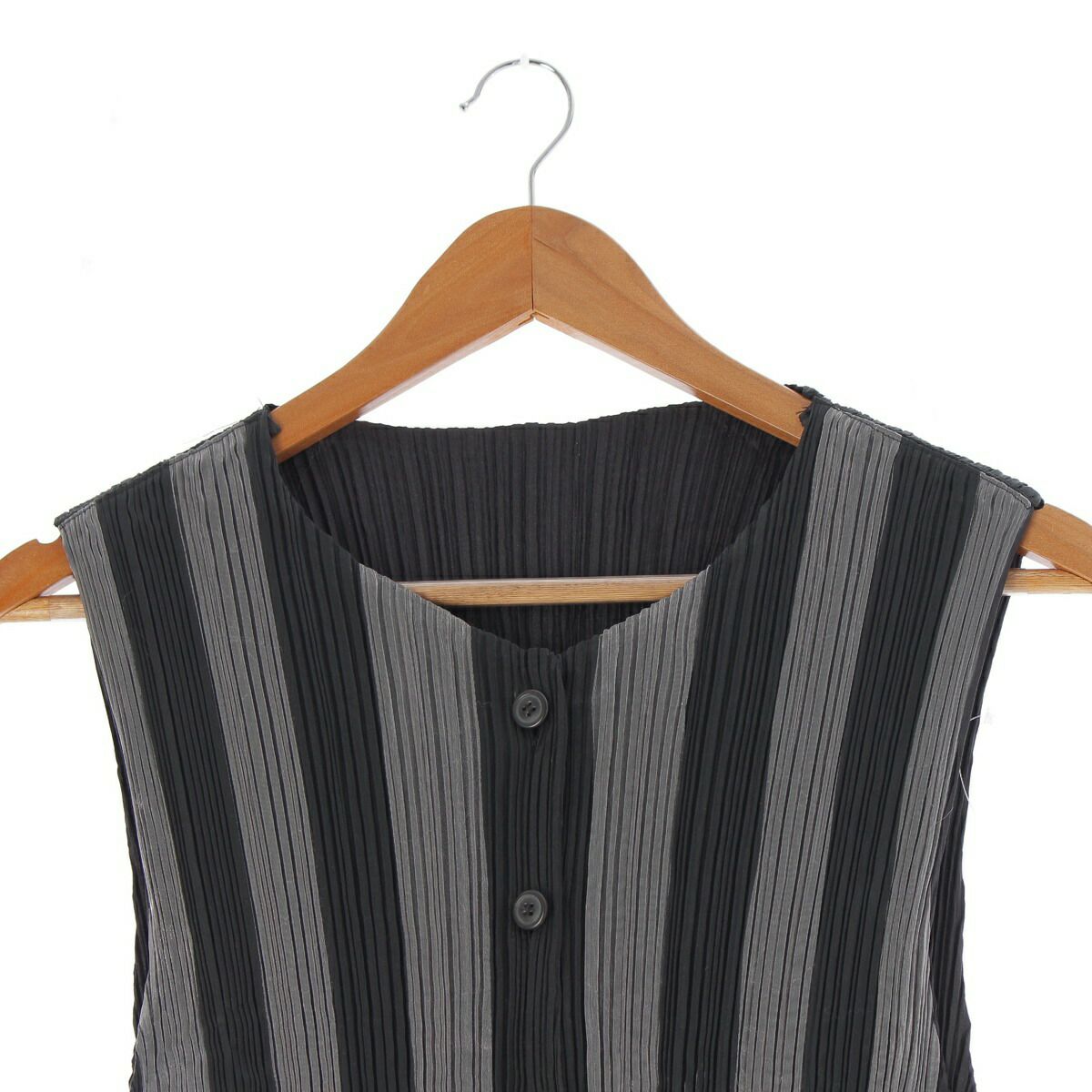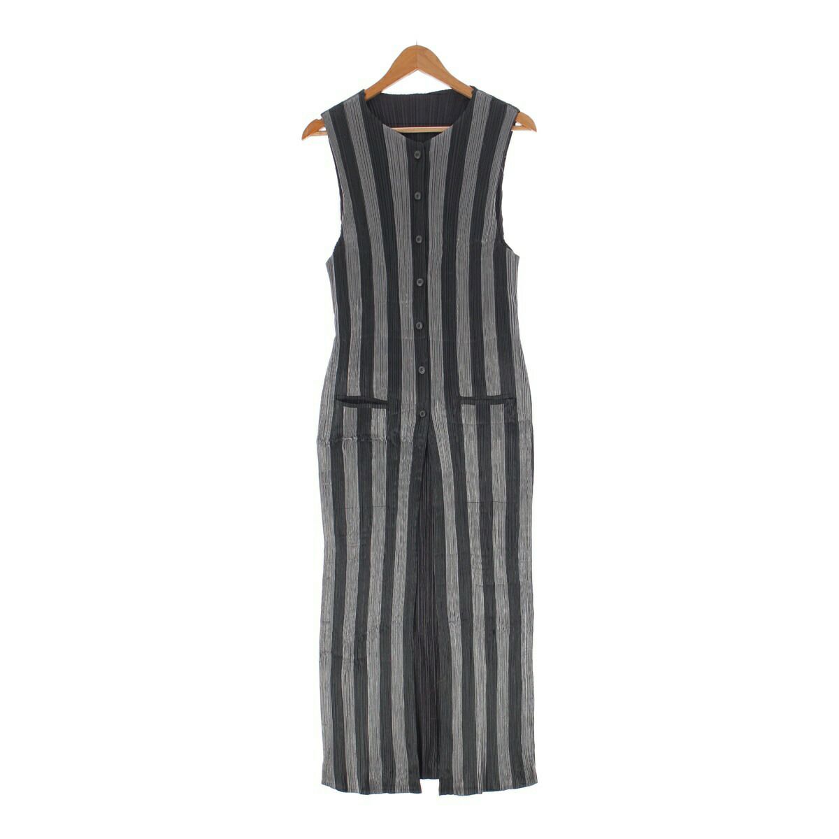イッセイミヤケ プリーツ ストライプ ロングジレ ノースリーブワンピース IM71-FE911 ブラック L