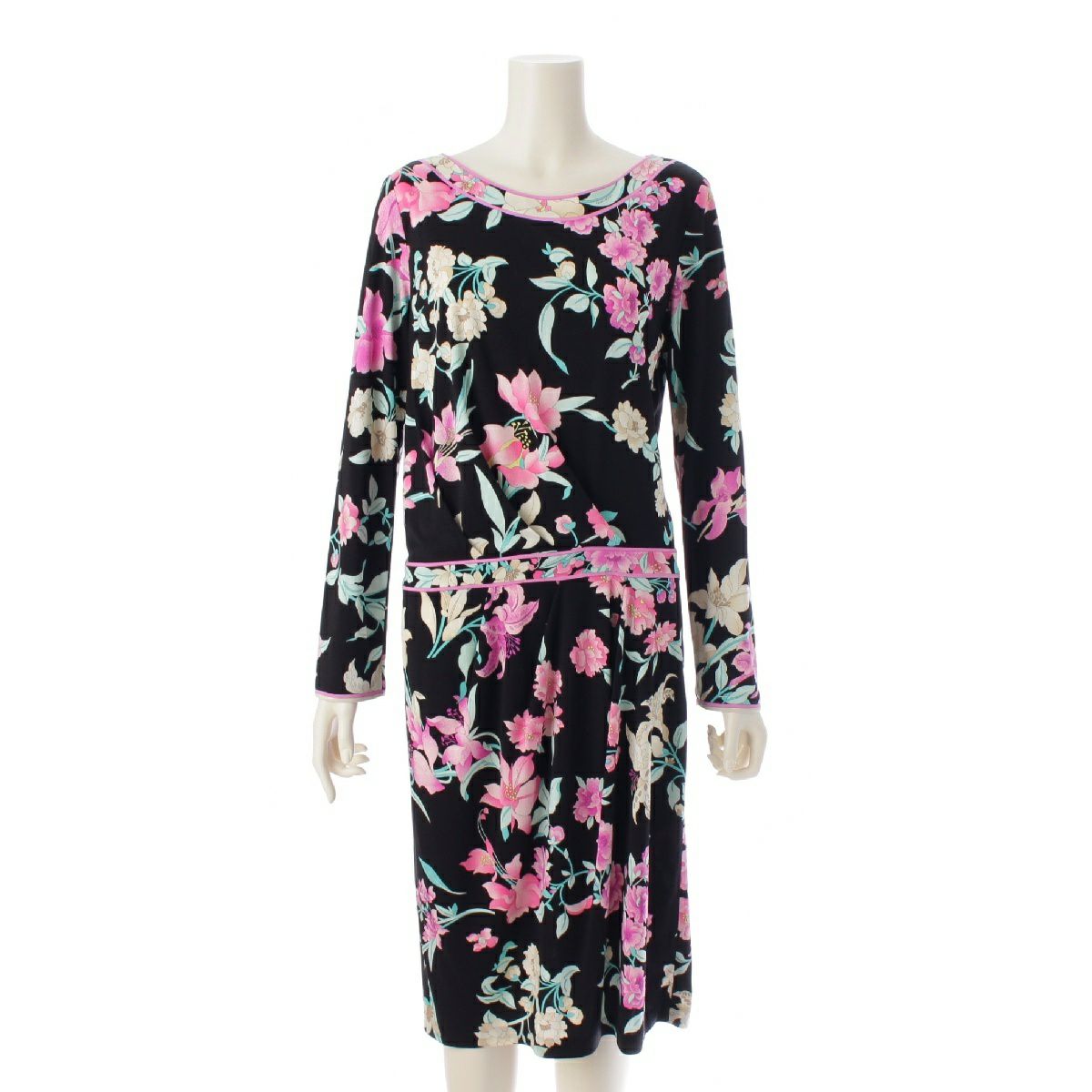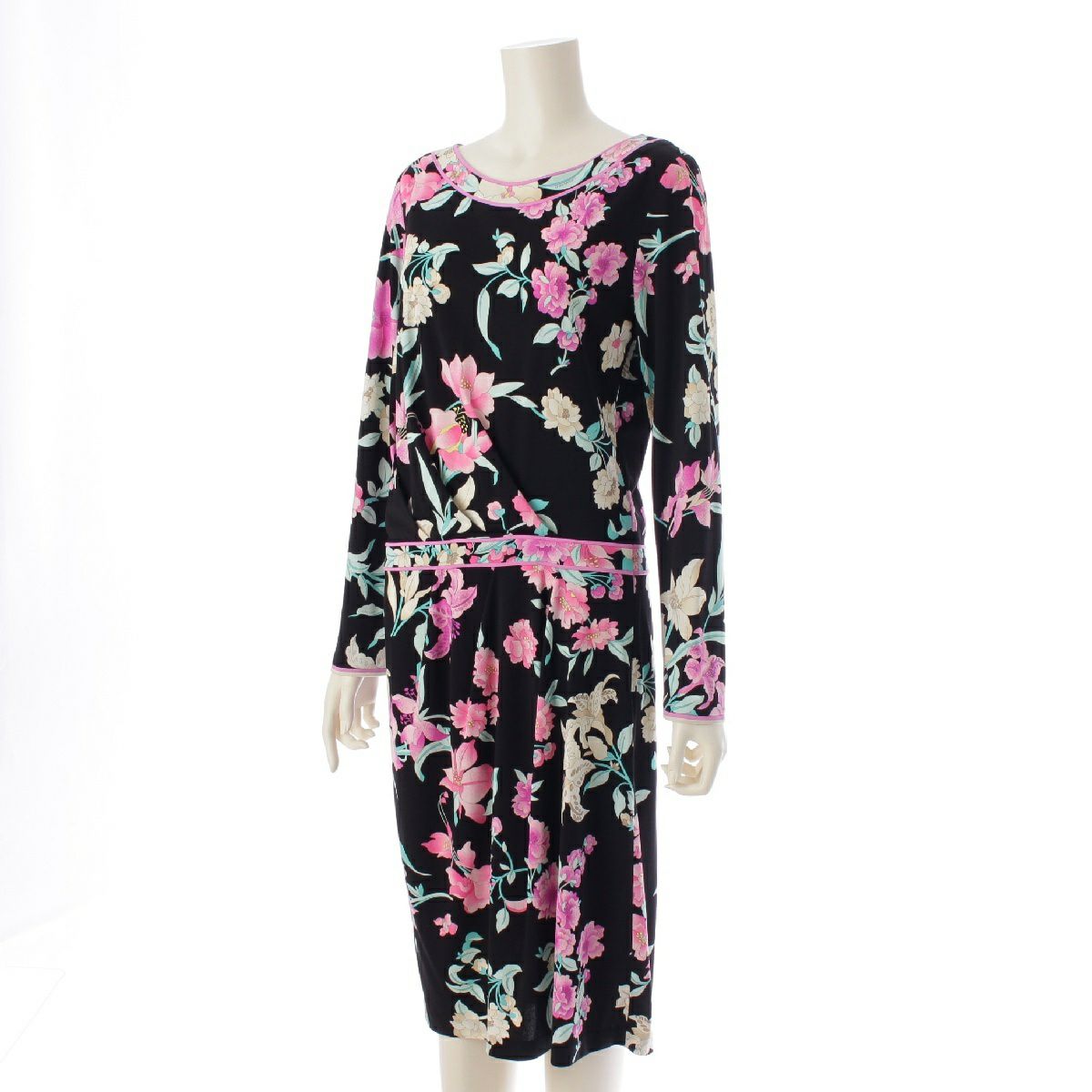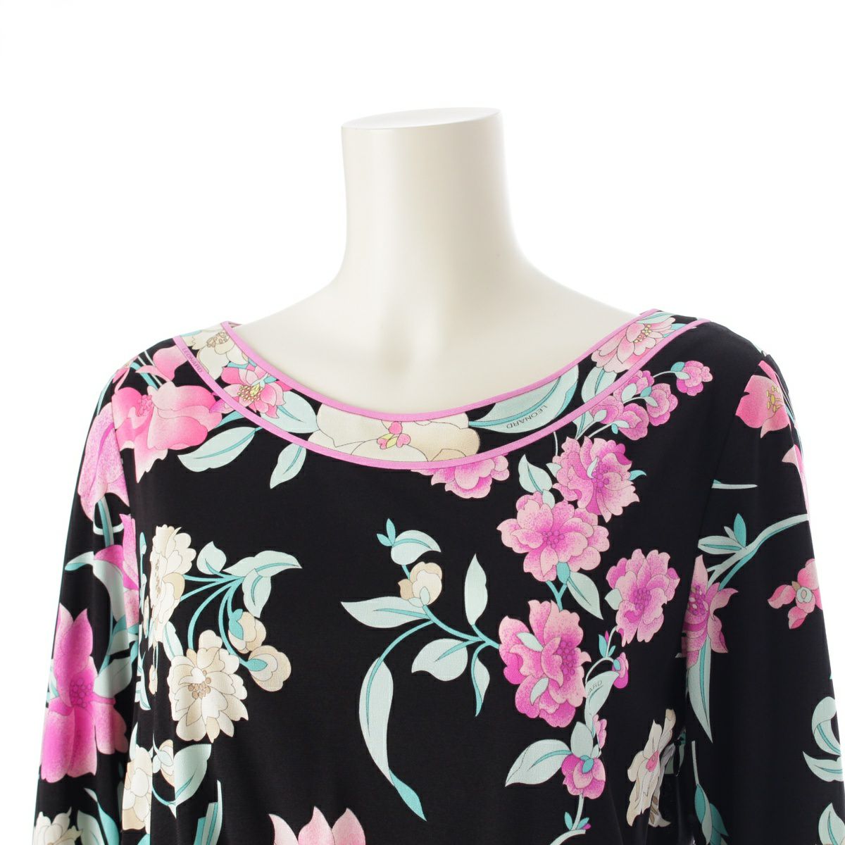 レオナール カンカン素材 花柄 ラウンドネック ワンピース ドレス 0160223 ブラック 40