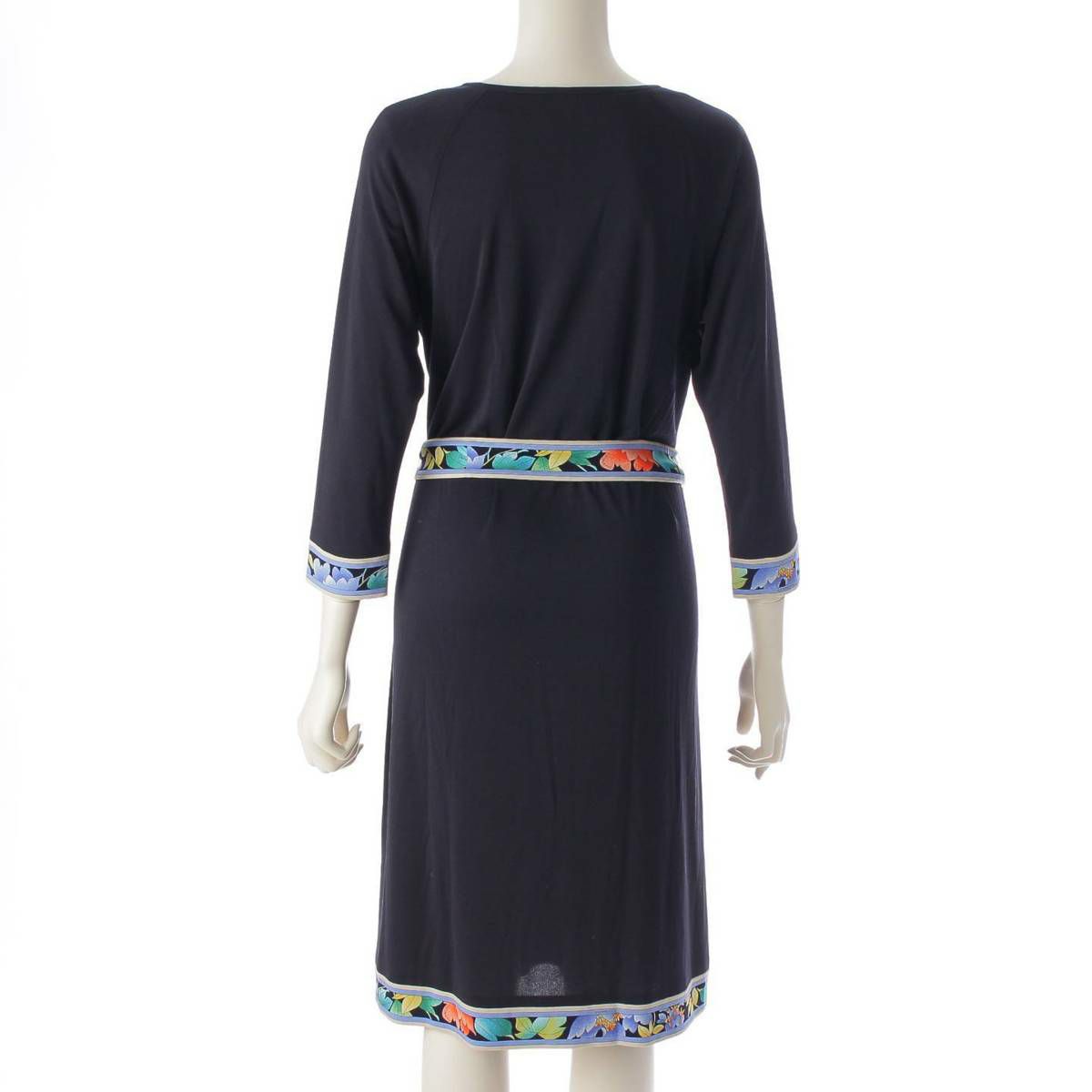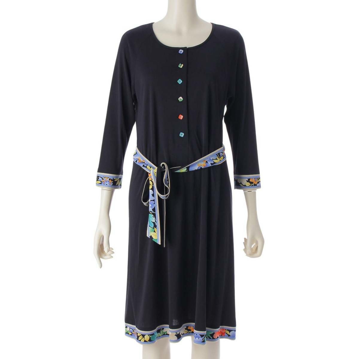レオナール LEONARD カンカン 七分丈 植物柄 フロントボタン ベルト ワンピース 0380822 ブラック M