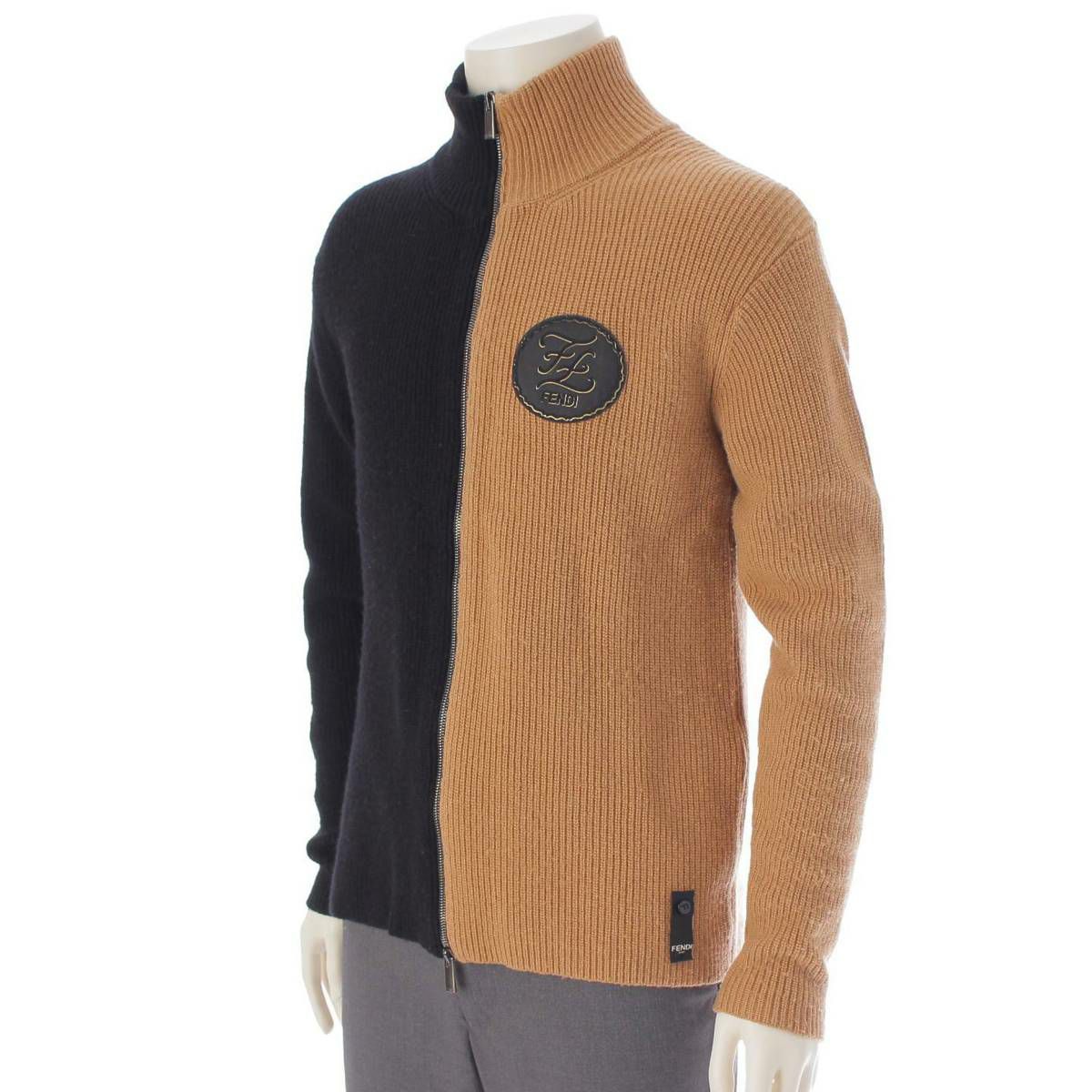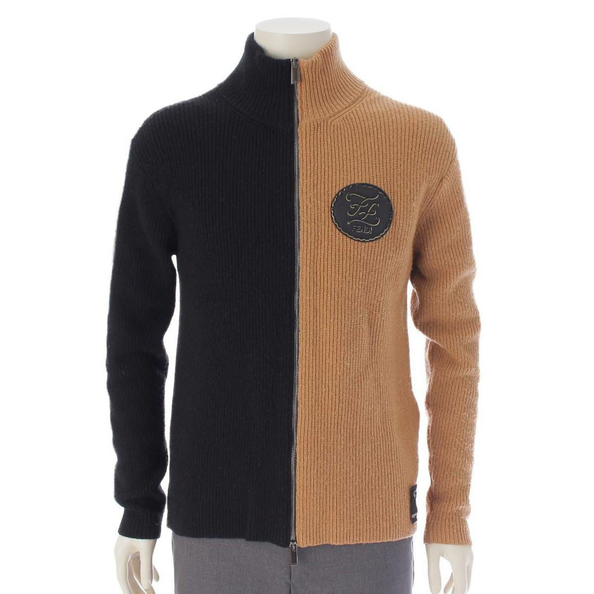 フェンディ メンズ FF ロゴ ジップアップ ウール ニット ブルゾン ブラウン×ブラック 44