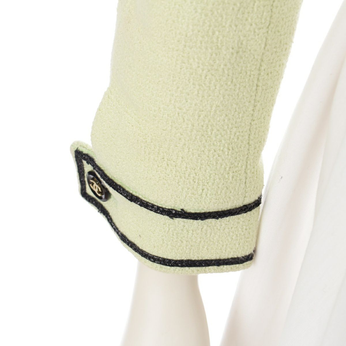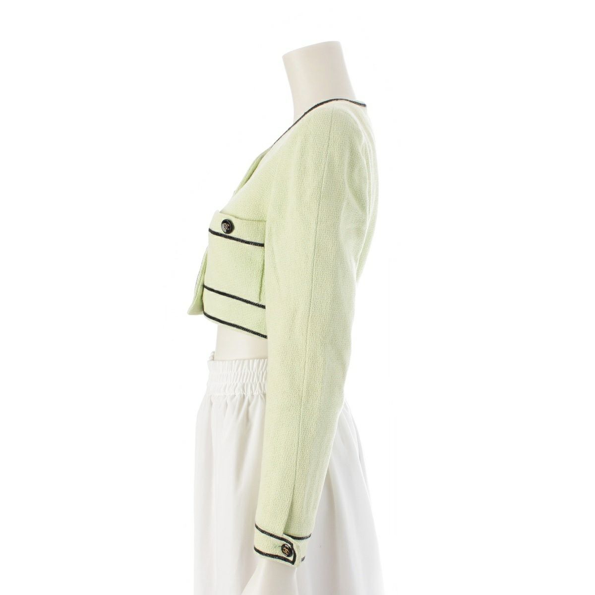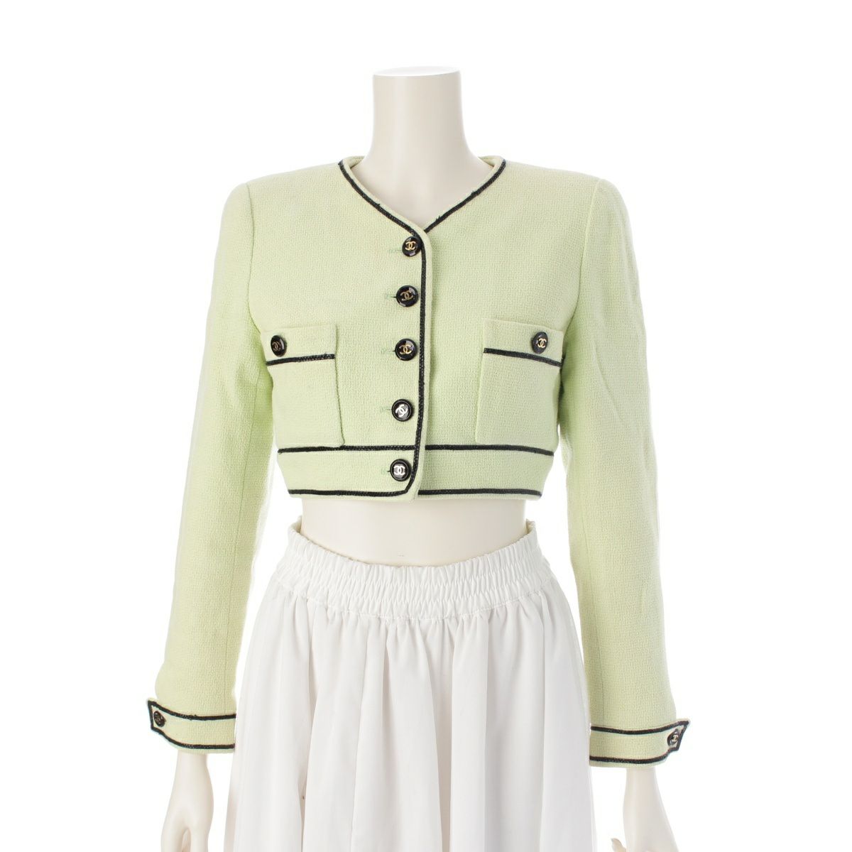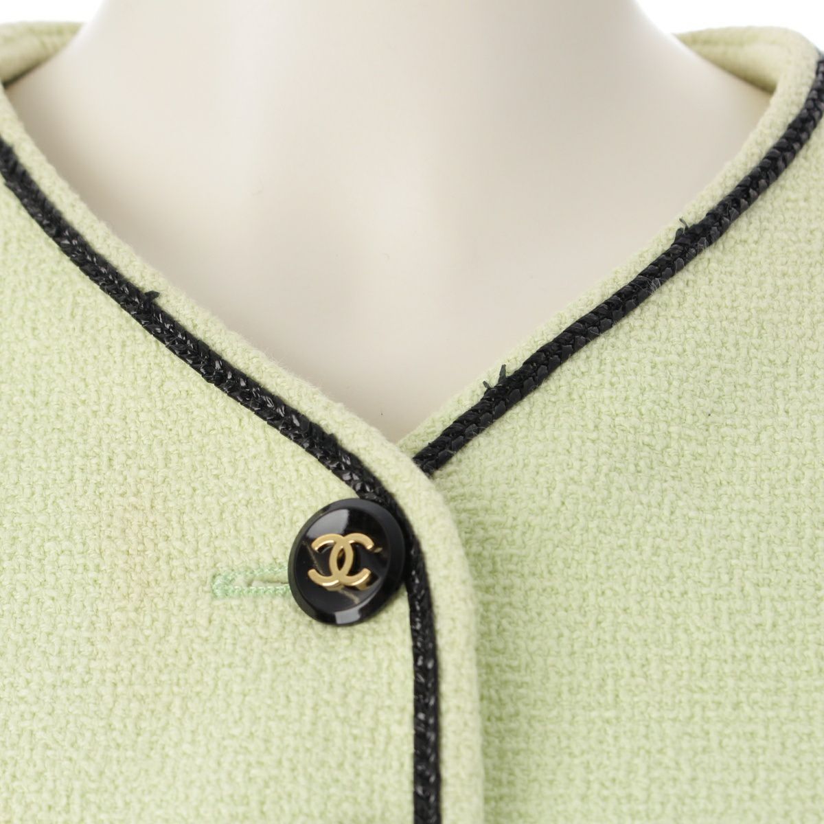 シャネル 95P コットン シルク ヴィンテージ クロップド ココボタン ノーカラージャケット トップス ライトグリーン 36