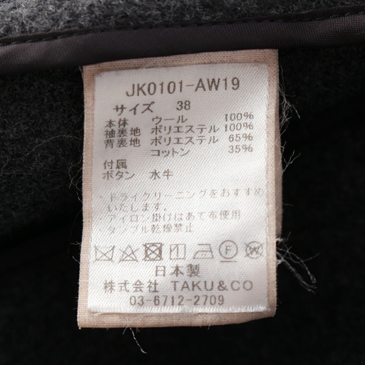 PELLEQ ペレック 19AW ウール ノーカラージャケット アウター JK0101-AW19 グレー 38