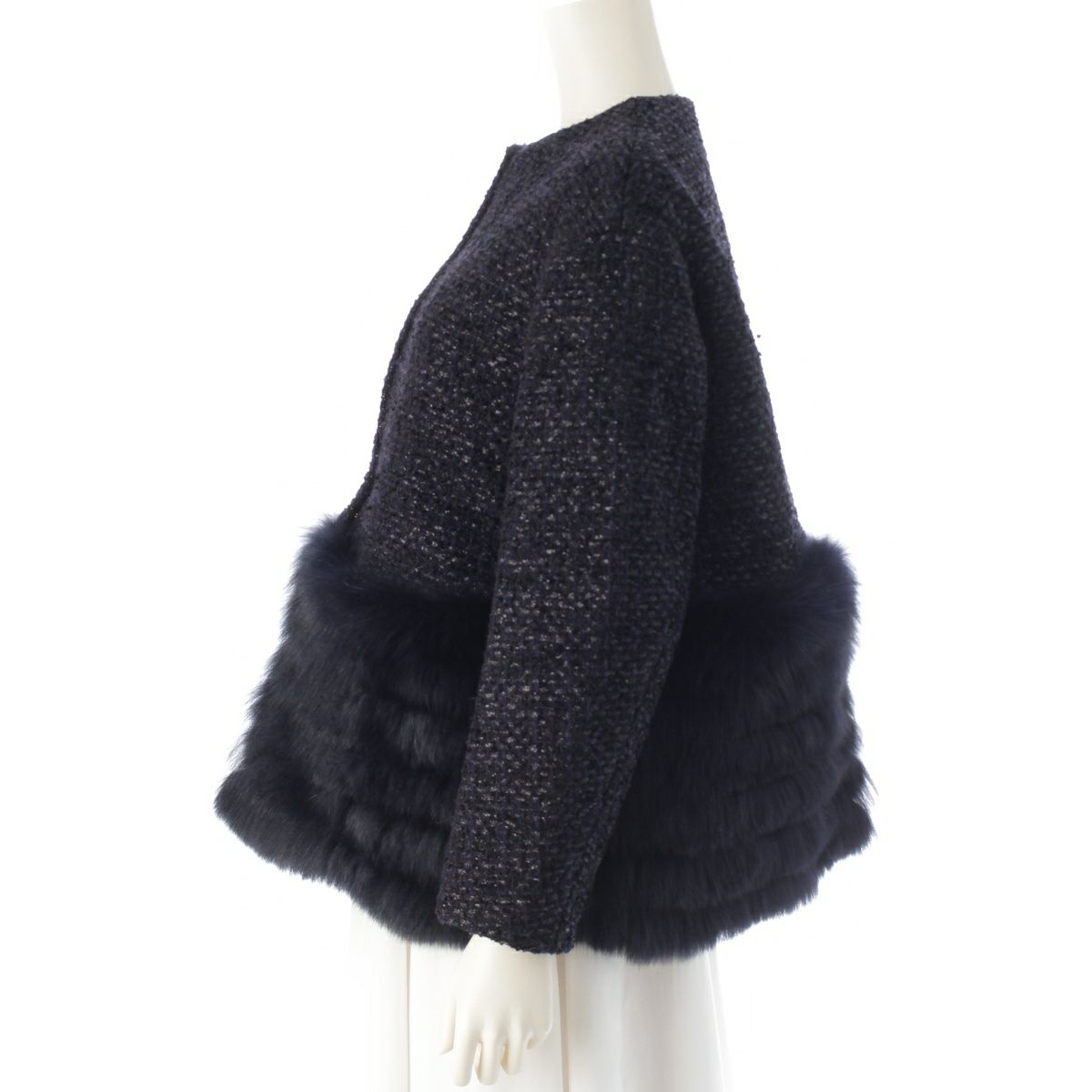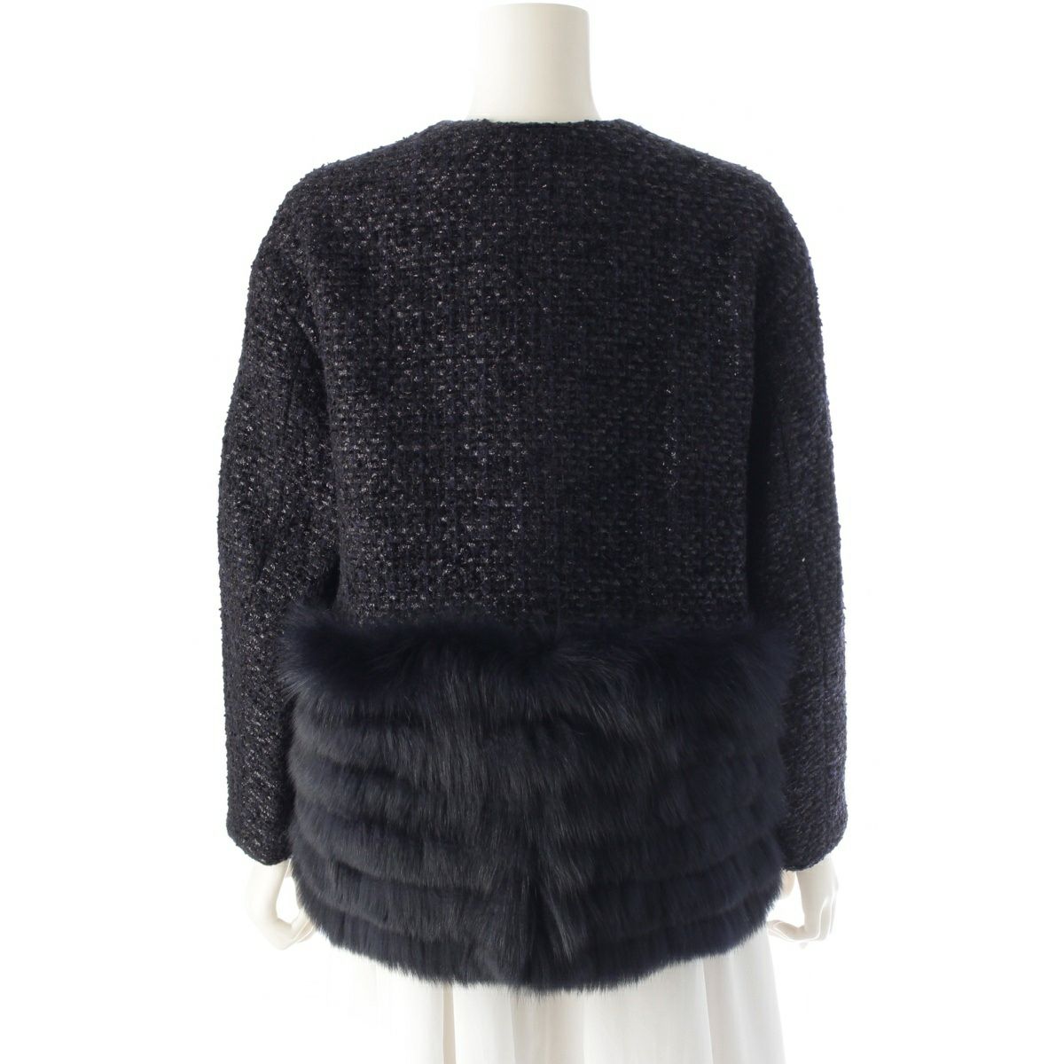 ドゥロワー 22AW ウール ナイロン コットン WINTER2 長袖 ラメツイード フォックスファー ノーカラージャケット アウター 6522-234-0737 ネイビー ブラック 36