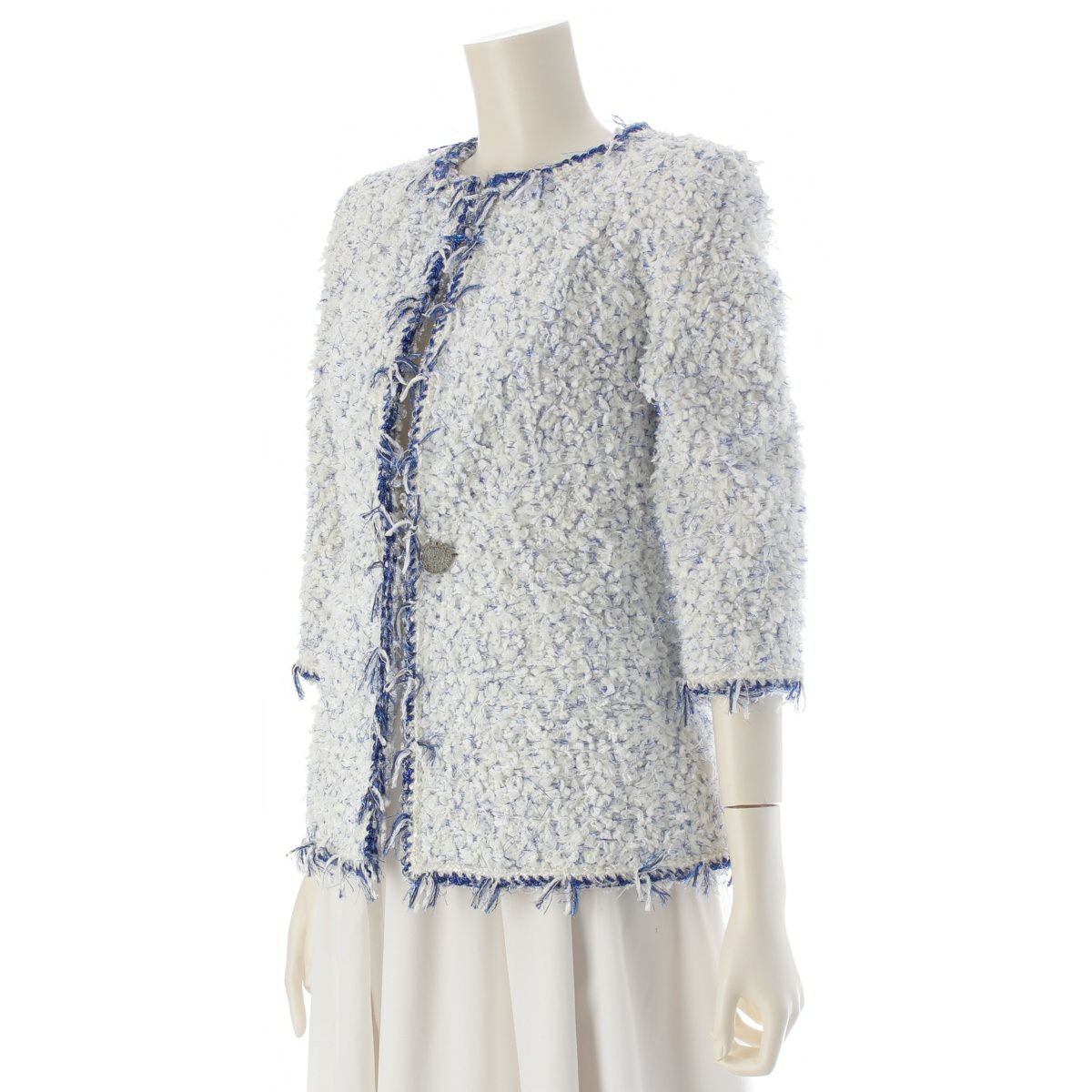 シャネル ナイロン コットン混 ラメ ツイード ノーカラージャケット P58634 ホワイト ブルー 34