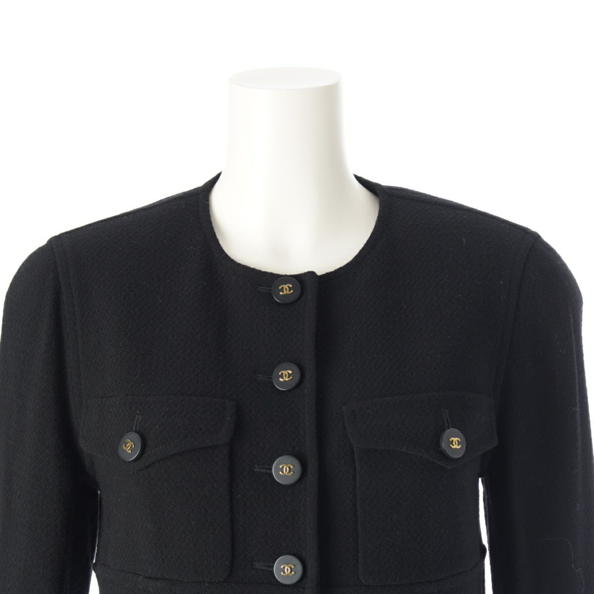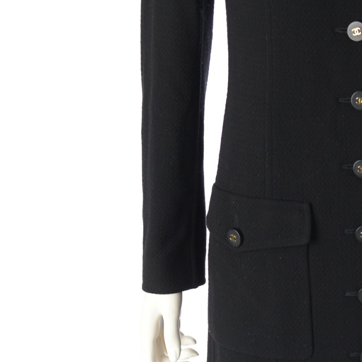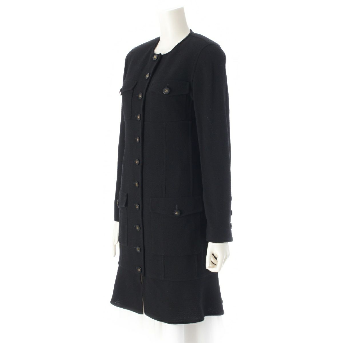 シャネル 94A ウール ツイード ヴィンテージ ココボタン ノーカラー ロング コート 4ポケット ワンピース ドレス P03699 ブラック 38