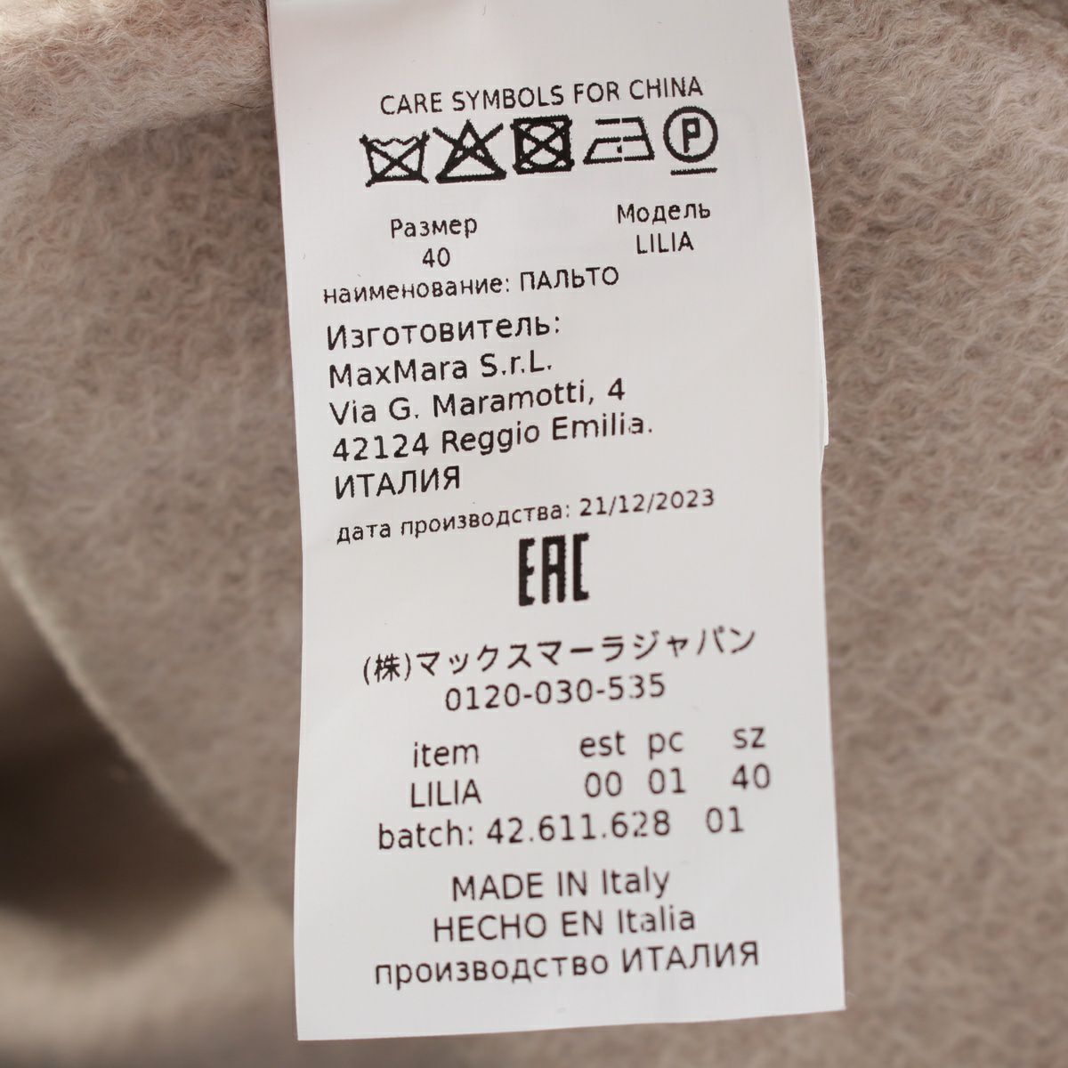 マックスマーラ LILIA リリア カシミヤ ベルト コート アウター 1016064106 ベージュ 40