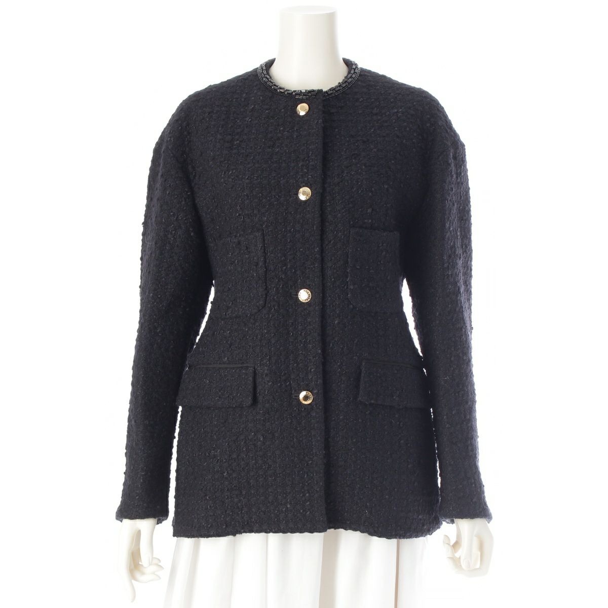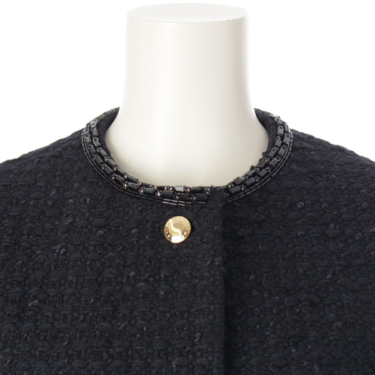 ドゥロワー 23年 ウール シルク コットン ビジュー ノーカラー ツイード テーラードジャケット 6522-299-0775 ブラック 36