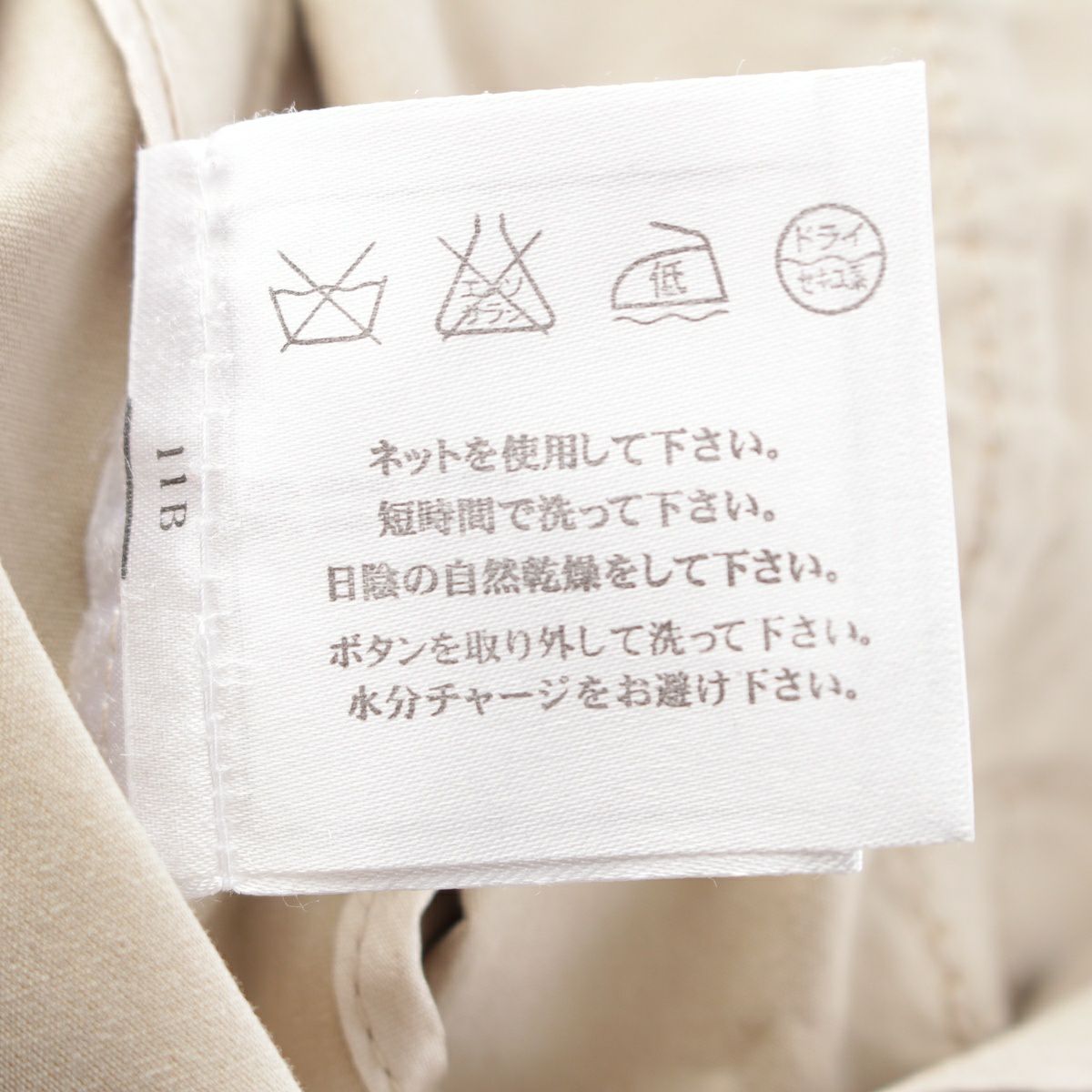 ダメージ箇所: 襟と裾と裏地に汚れ、ボタンに緩み、ベルトに汚れ、
