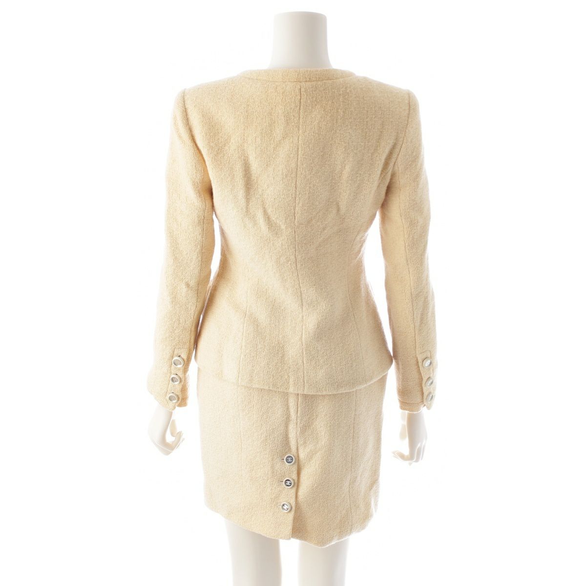 シャネル 90s ウール ツイード ココボタン ミラー ノーカラー ジャケット スカートセットアップ スーツ イエロー