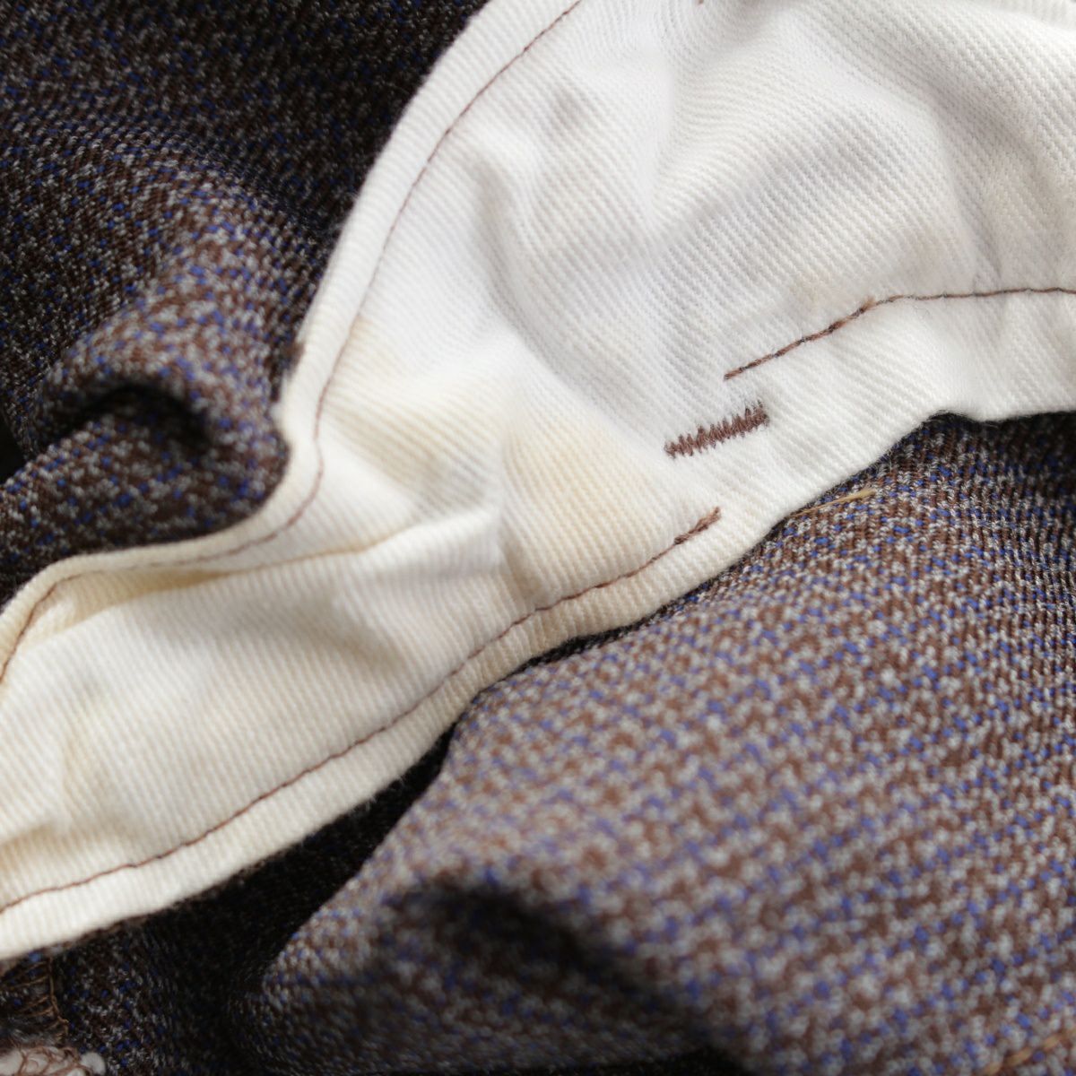 ダメージ箇所: ジャケット表面に汚れ/毛羽立ち、ジャケット内側に汚れ/縫製取れ、パンツ内側に汚れ/縫製取れ、ボタンに擦れ/傷、タグに汚れ/毛羽立ち、保管臭のようなニオイ ※ジャケットとパンツの色味に違いあり