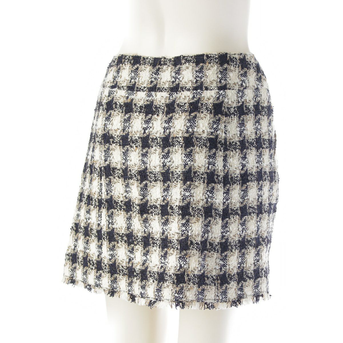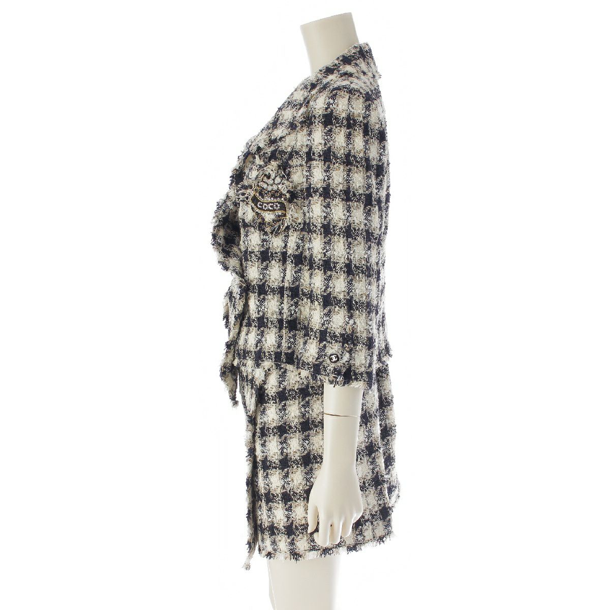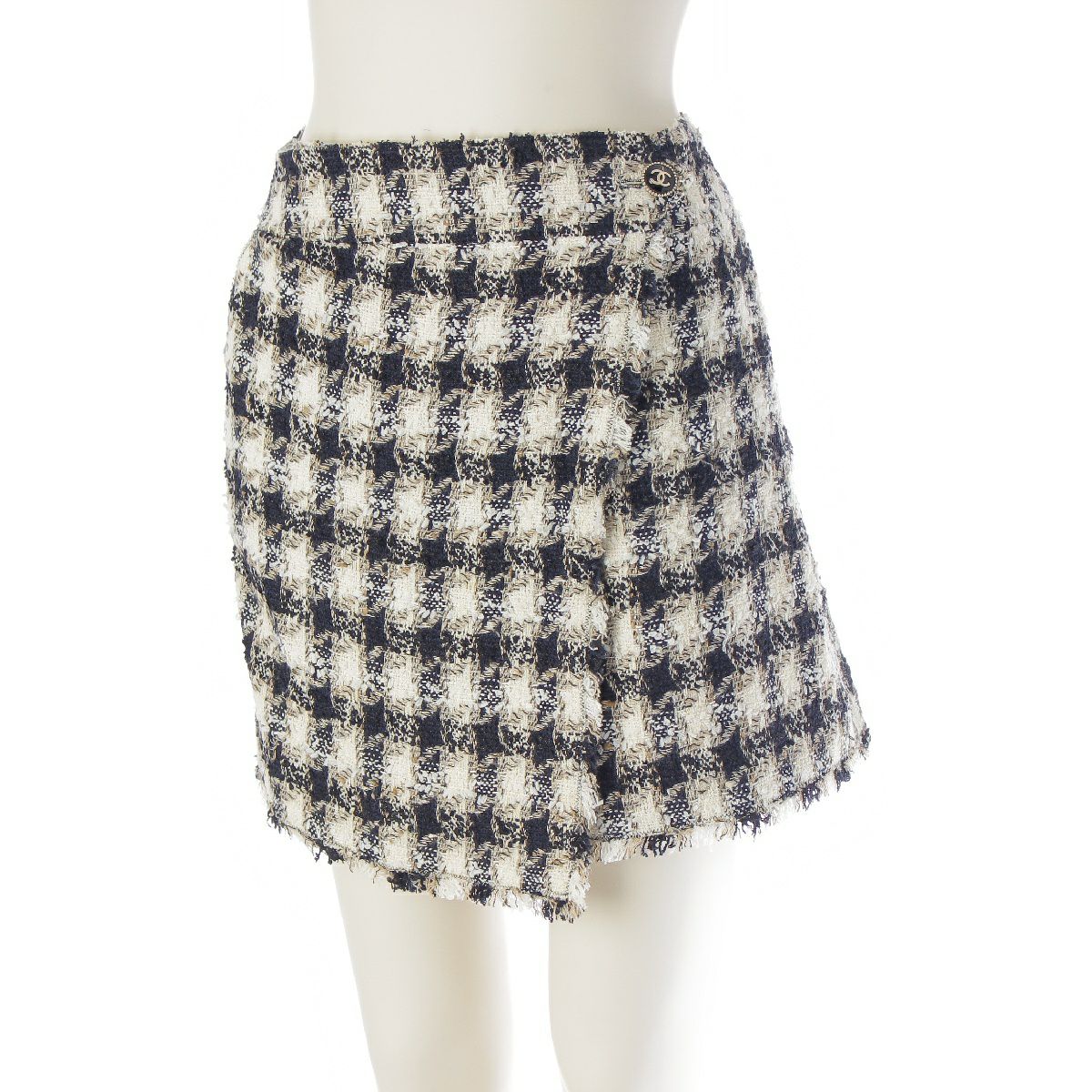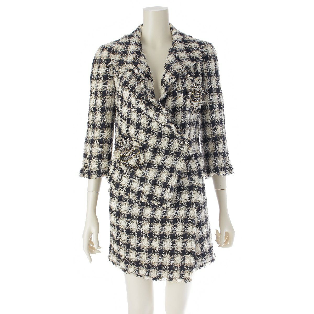 シャネル 07P ツイード ココマークボタン ビジュー COCOエンブレム アシメントリー ジャケット スカートセットアップ チェック柄 七分袖 ミニ丈 P31081/P31082 ブラック ホワイト 36
