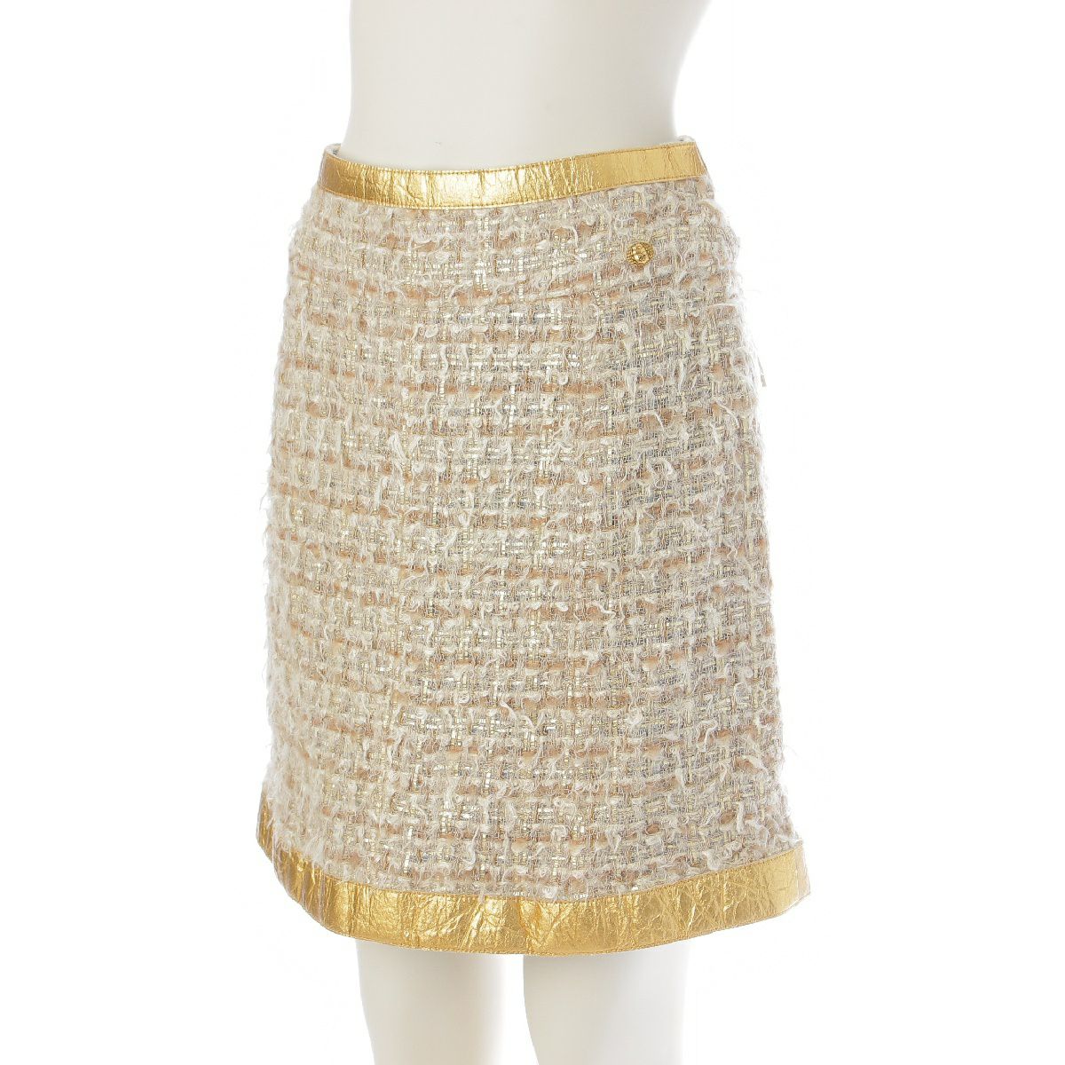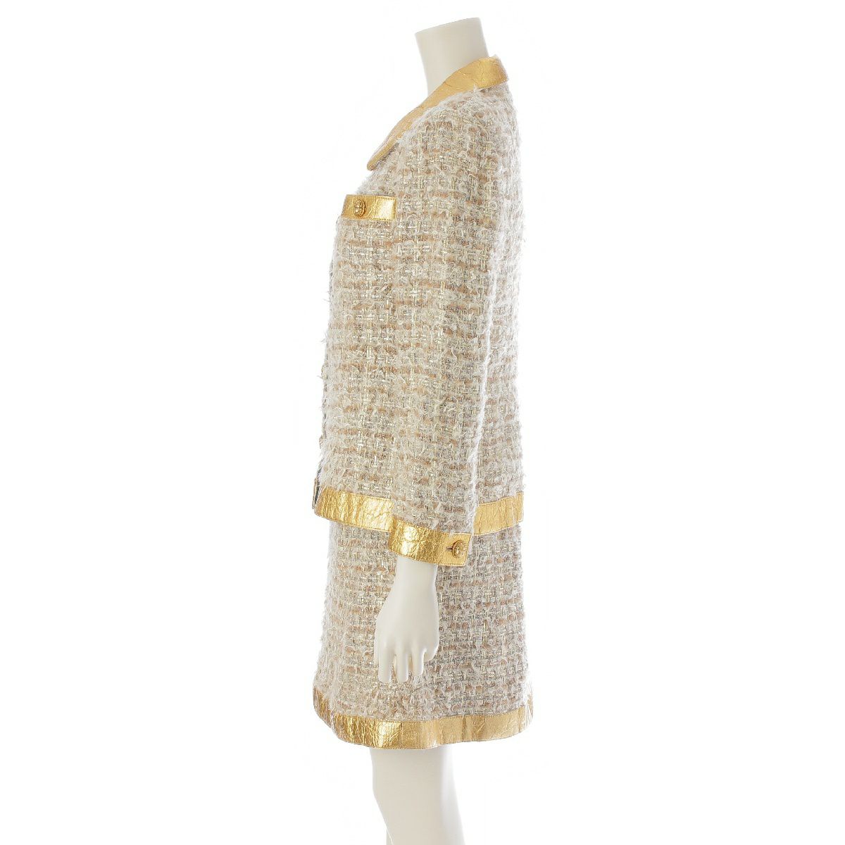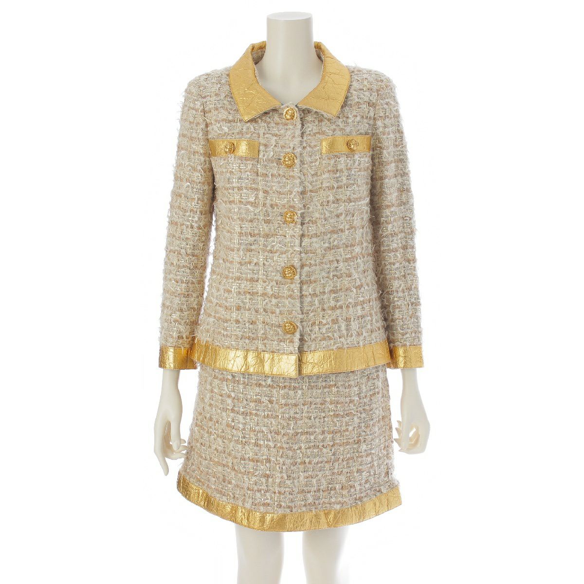 シャネル 19A シルク ウール コットン ツイード スカラベボタン ジャケット スカートセットアップ P61852/P61853 ゴールド ベージュ 36