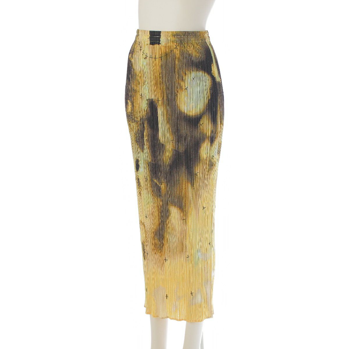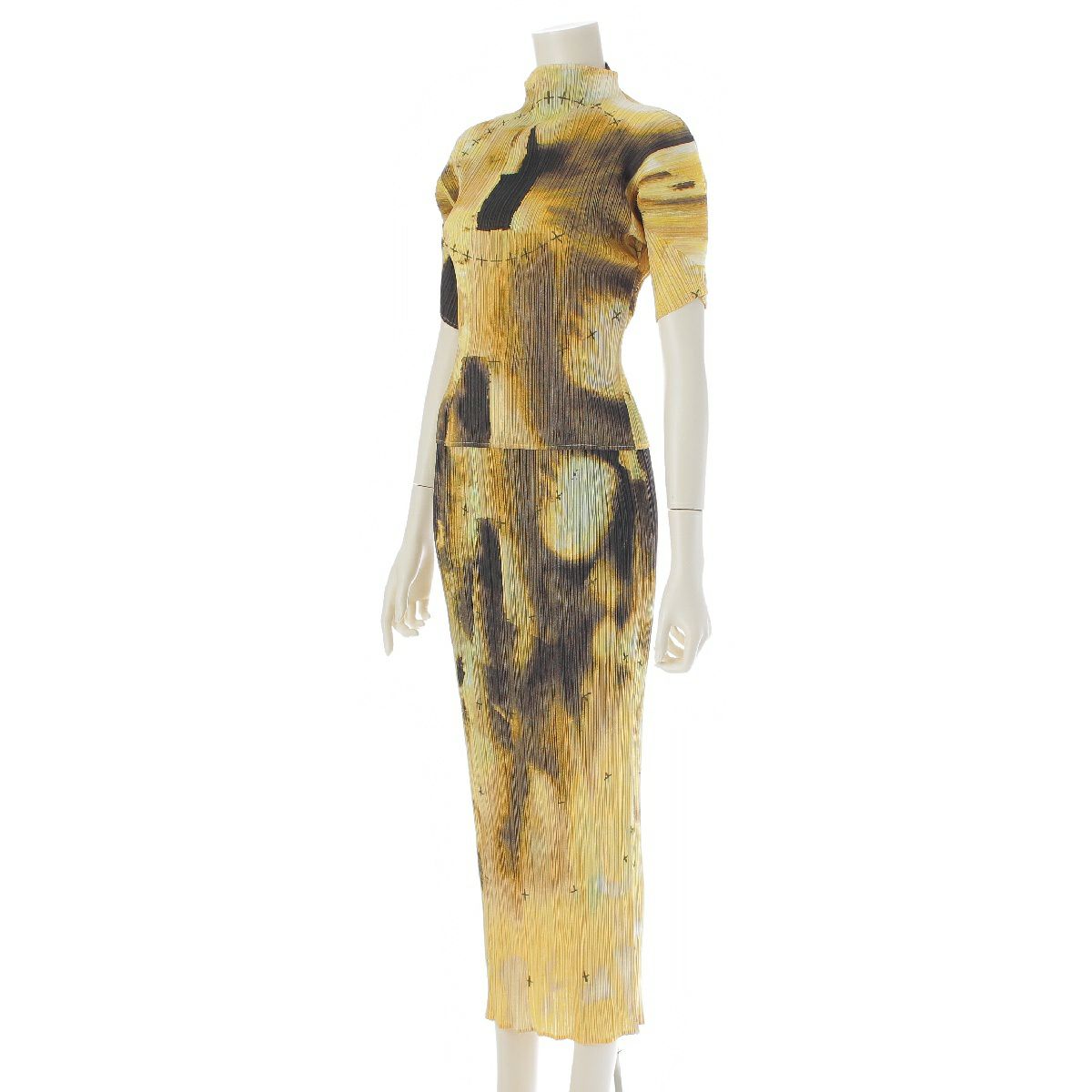 プリーツプリーズ イッセイミヤケ 1999 ボトルネック 総柄 トップス スカートセットアップ 半袖 ロング丈 PP92-JK085/PP92-JG081 イエロー系マルチカラー 3