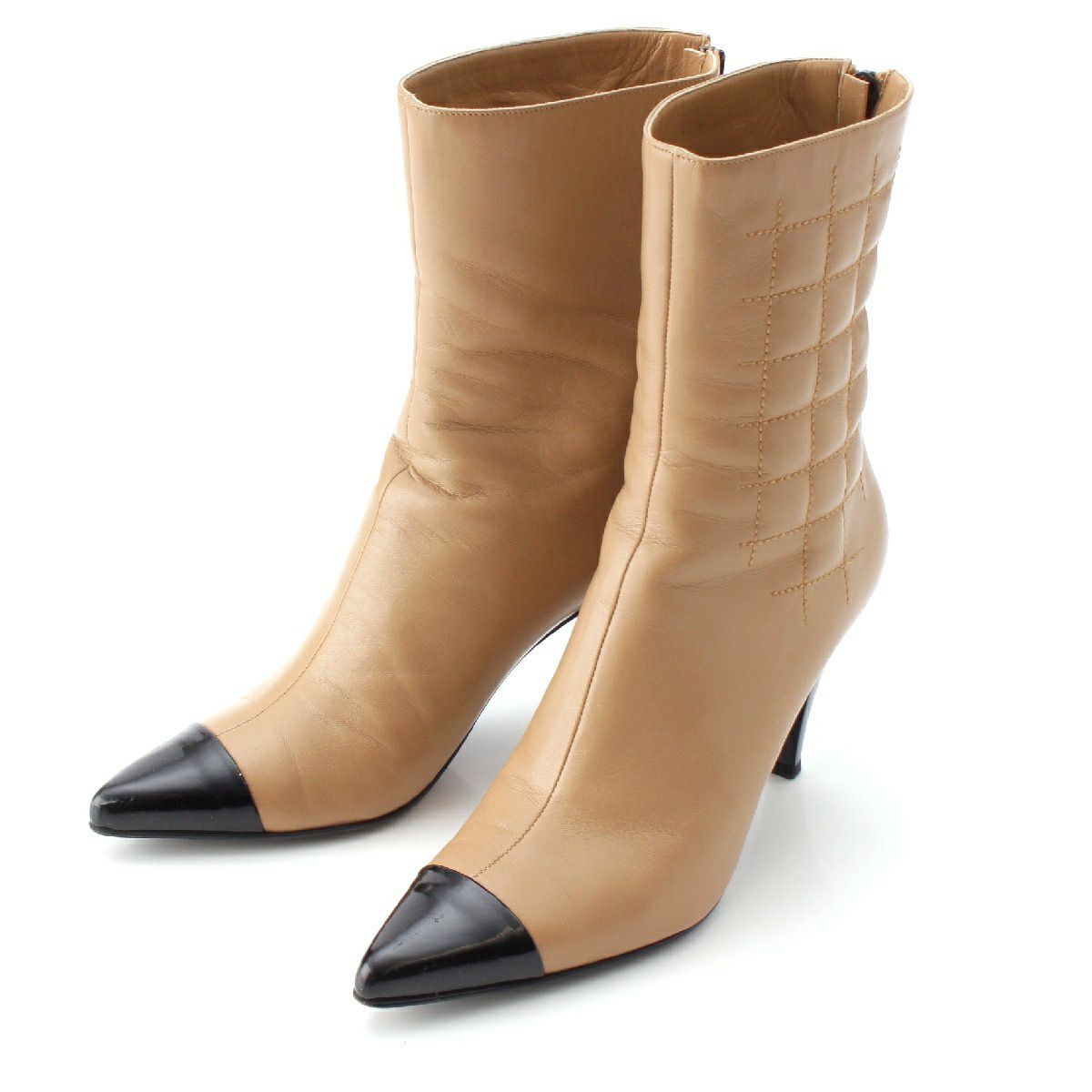 シャネル レザー ココマーク チョコバー アンクル ショート ヒール ブーツ ポインテッドトゥ バイカラー ベージュ 37