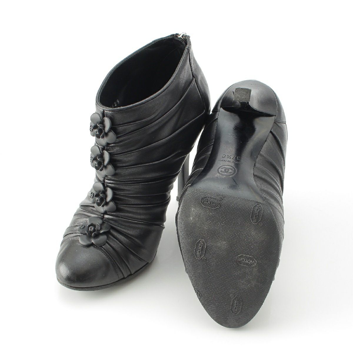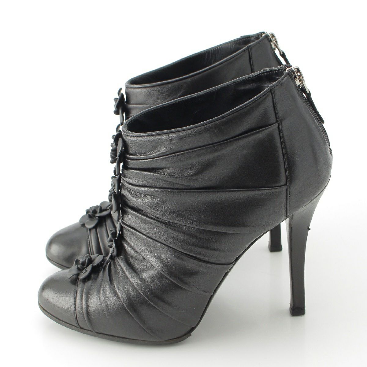 シャネル レザー カメリア ココマーク アンクル ショート ヒール ブーティ ブーツ G28629 ブラック 37 1/2