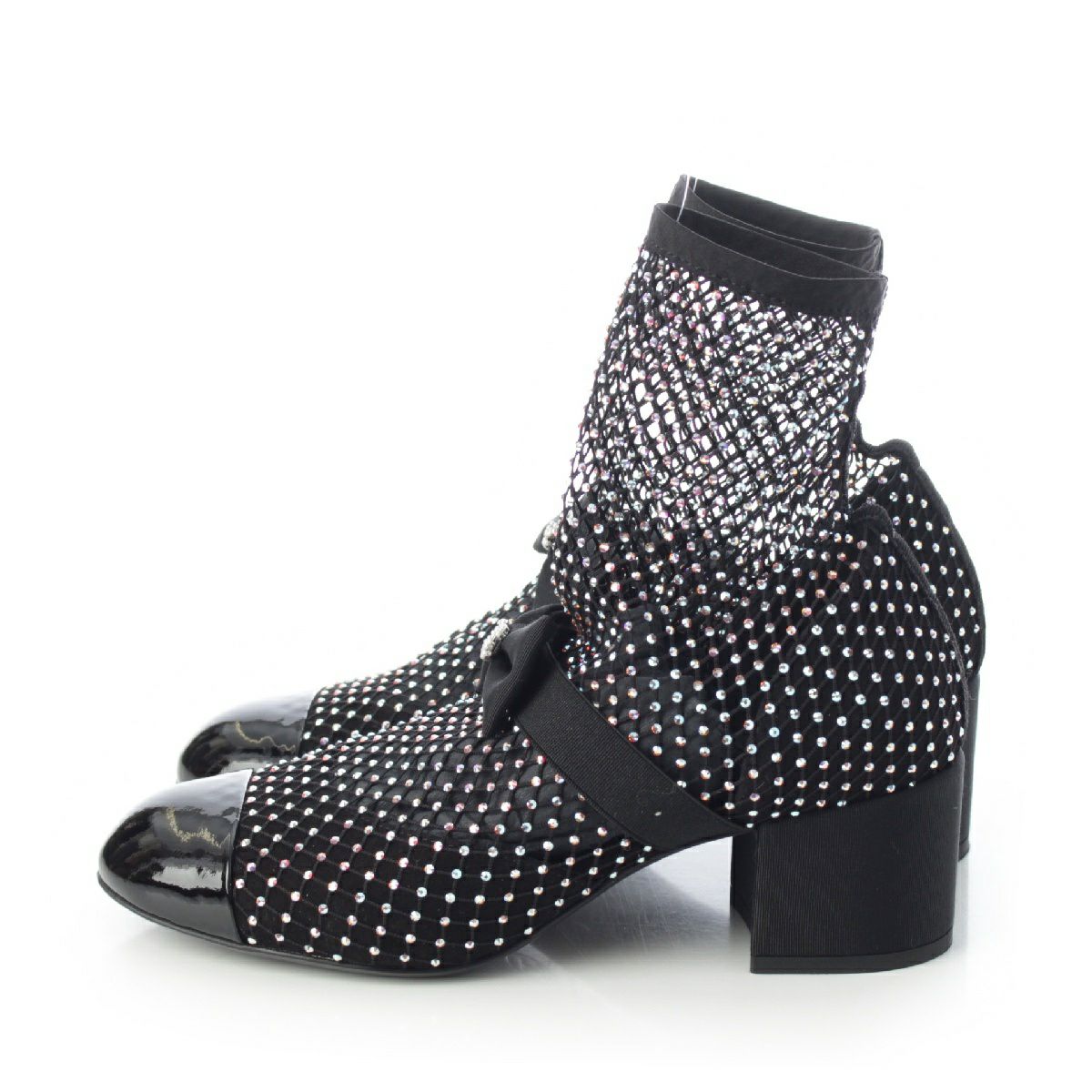シャネル 23S ココマーク リボン ビジュー メッシュ ブーツ ショート ヒール G40097 ブラック 36C