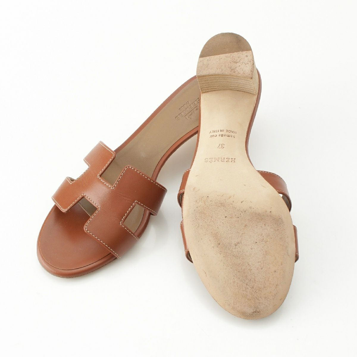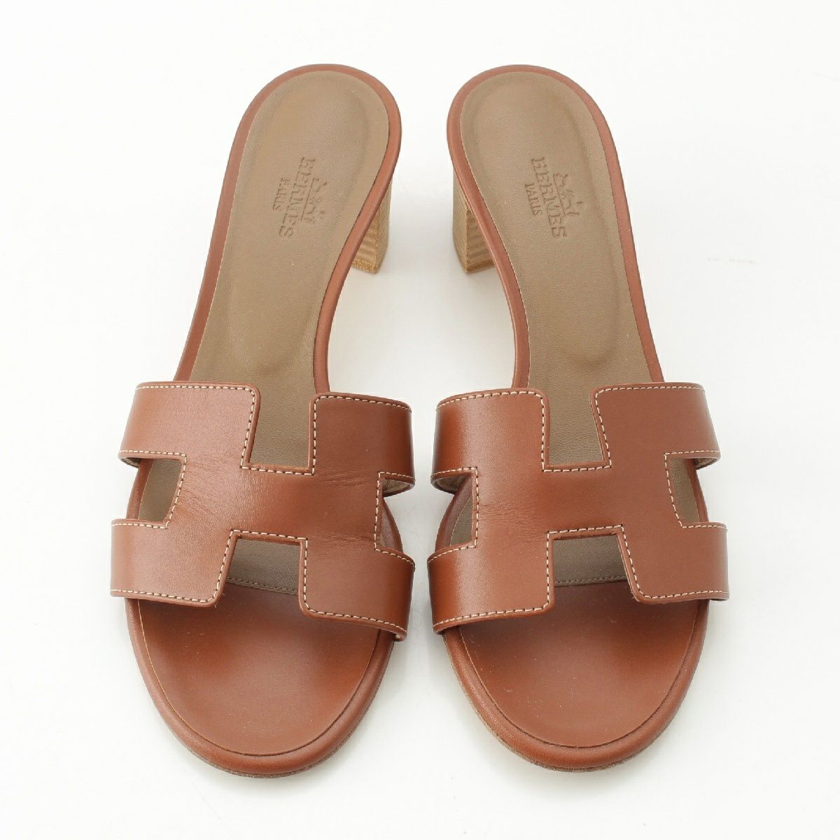 エルメス オアジス レザー Hモチーフ ヒール ミュール サンダル ゴールド ブラウン系 37