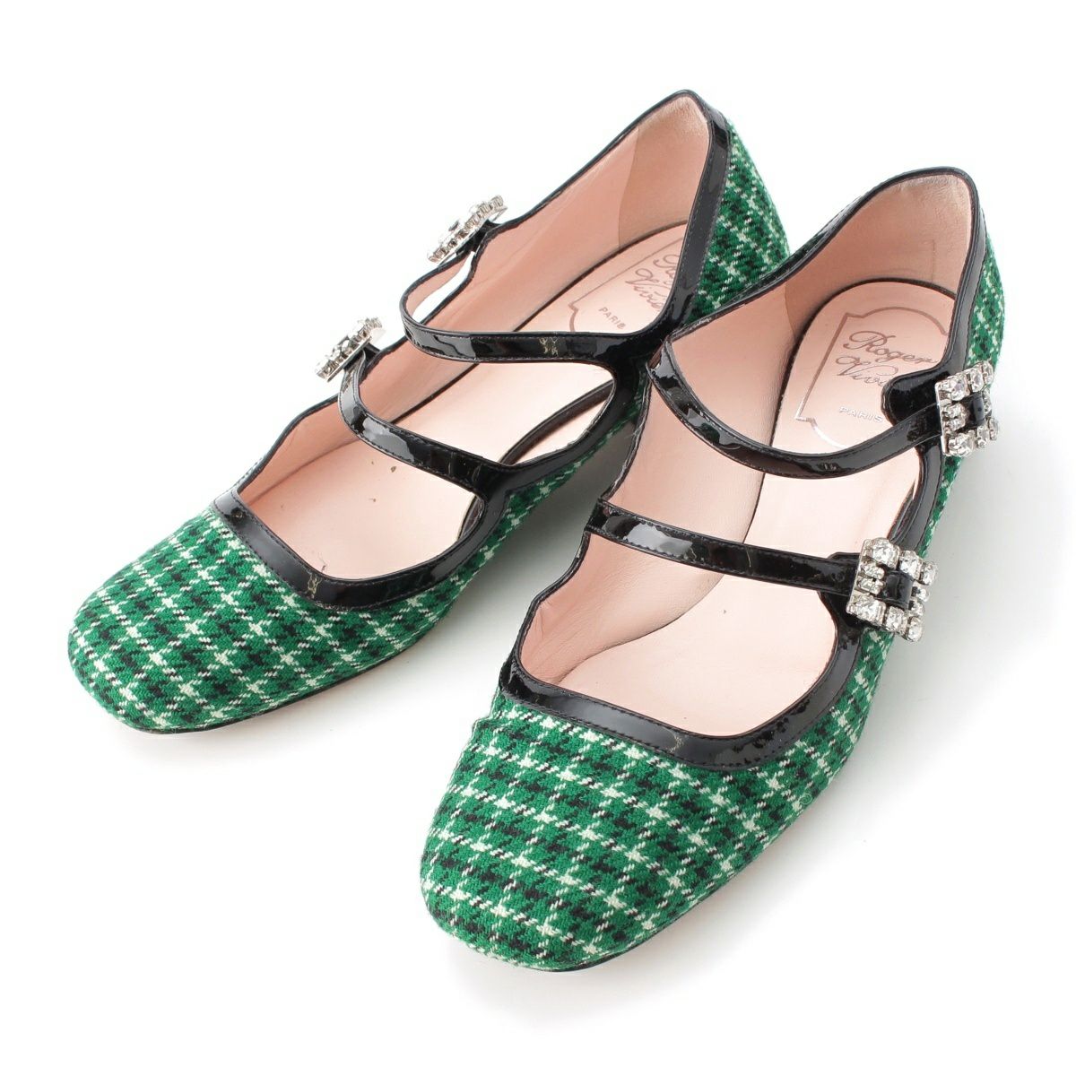 ロジェヴィヴィエ パテントレザー ファブリック ビジュー ストラップ メリージェーン サンダル グリーン ブラック 36