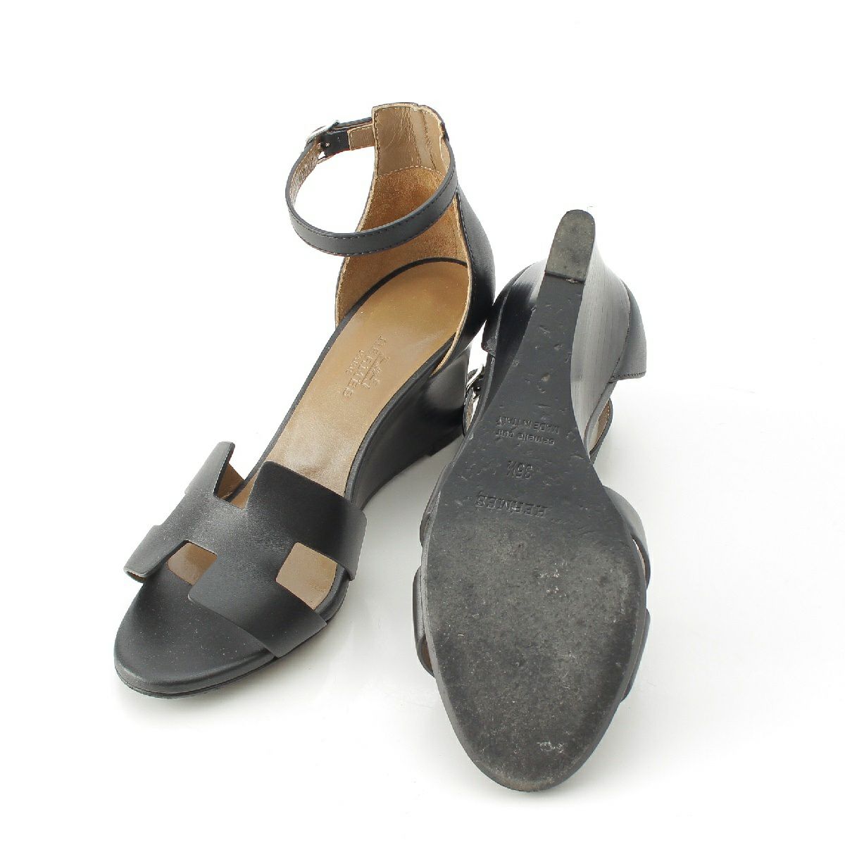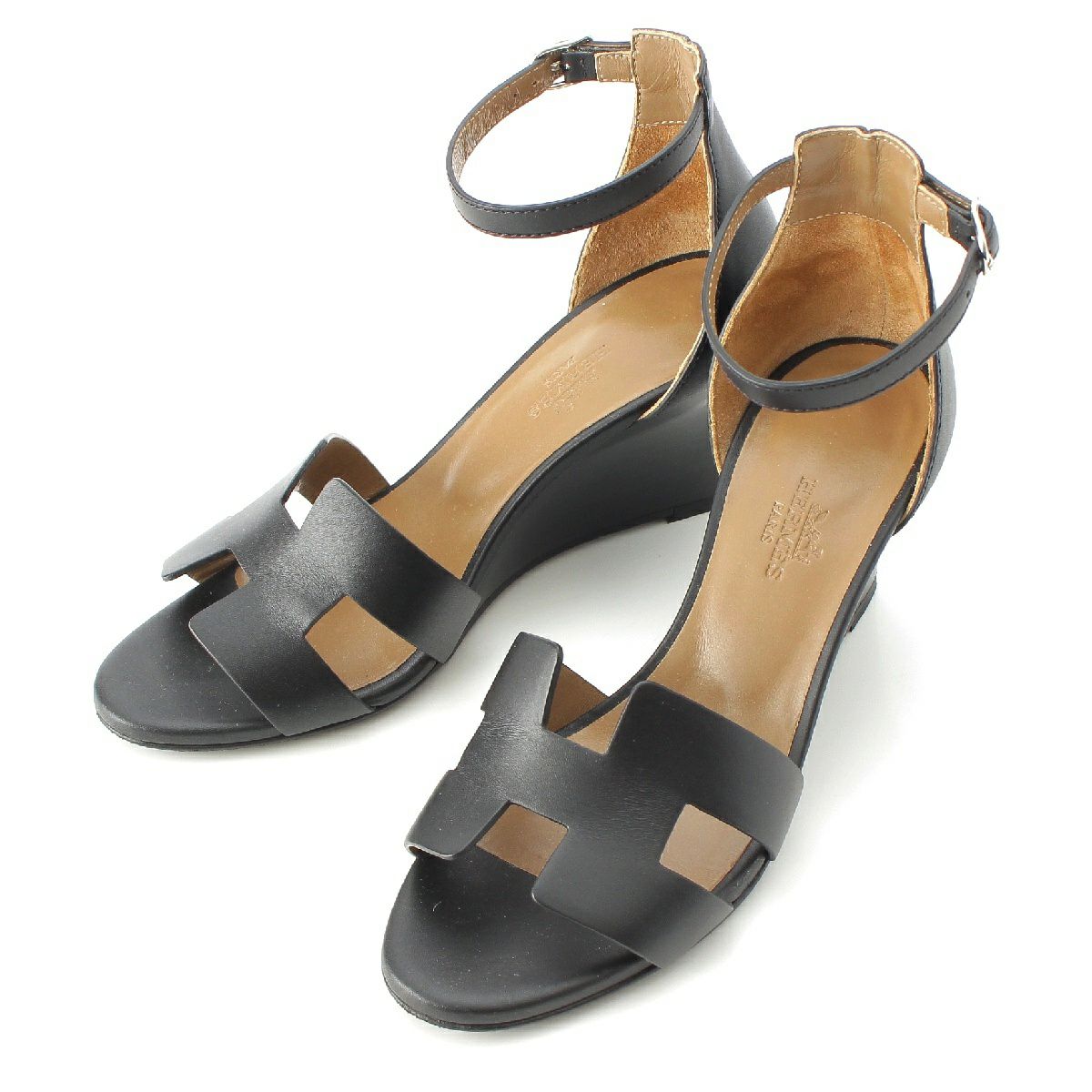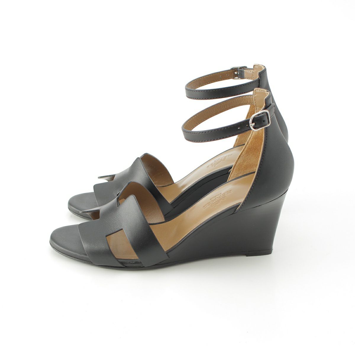 エルメス レジェンド レザー Hロゴ アンクルベルト ウェッジヒール サンダル ブラック 37