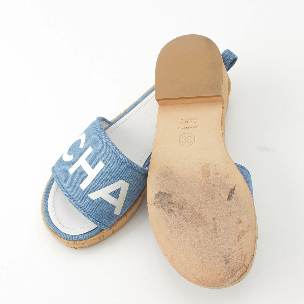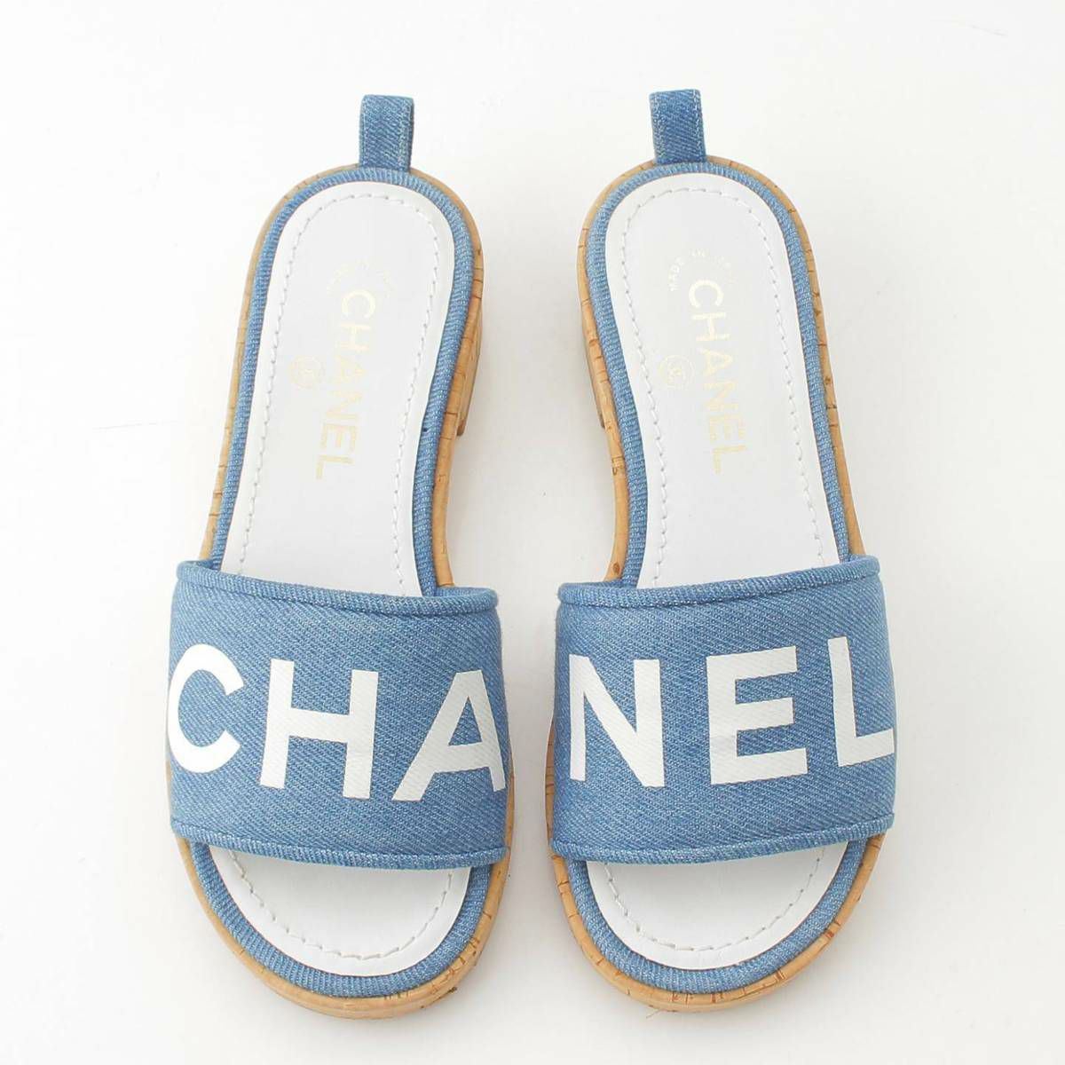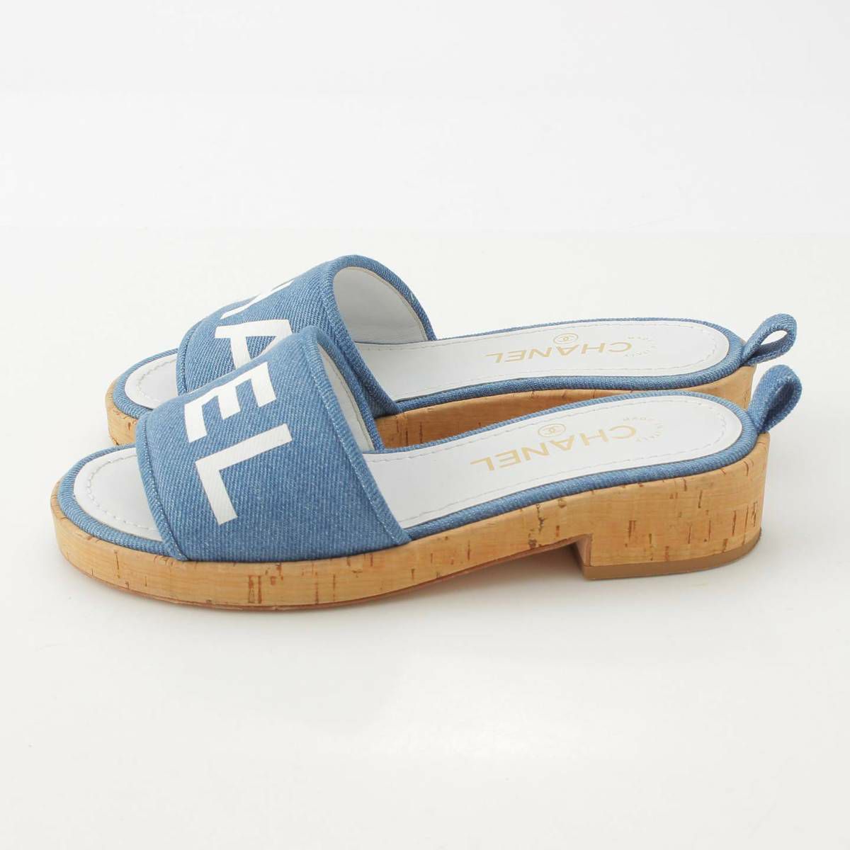 シャネル 19SS デニム ロゴ コルクソール サンダル ミュール G34876 ブルー×ホワイト 35 1/2