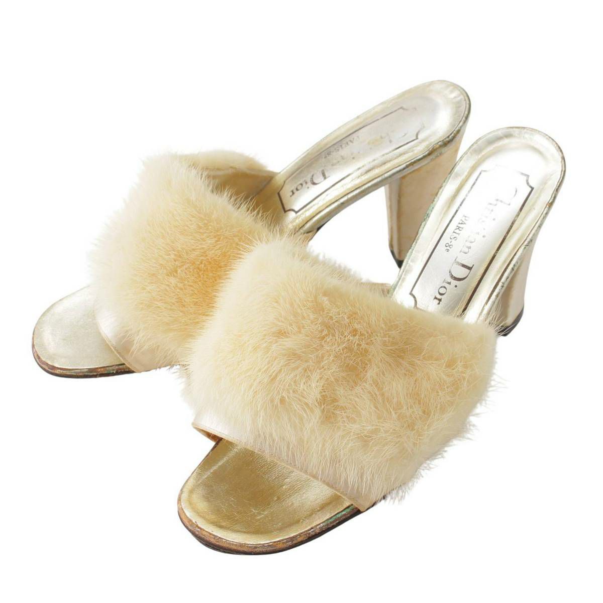【ディオール】DIOR ミンクファー レザー ヒール サンダル ミュール ゴールド×ベージュ 4 1/2 【中古】【鑑定済・正規品保証】198545