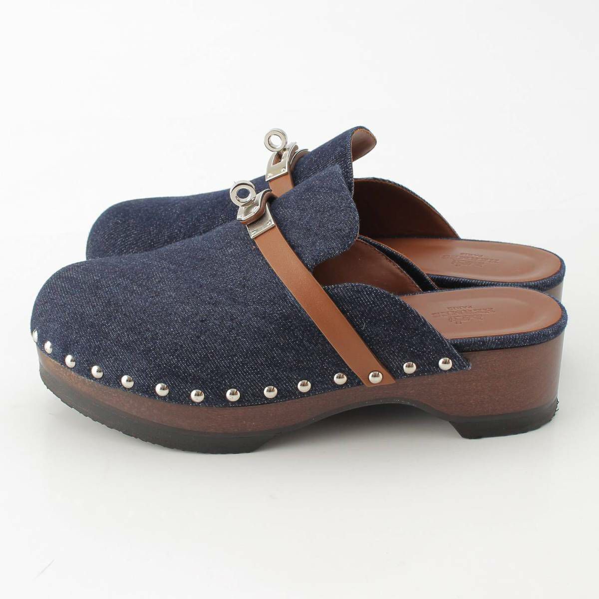 エルメス カルロッタ ウッド デニム スタッズ 厚底 サボサンダル シューズ ブルー 37