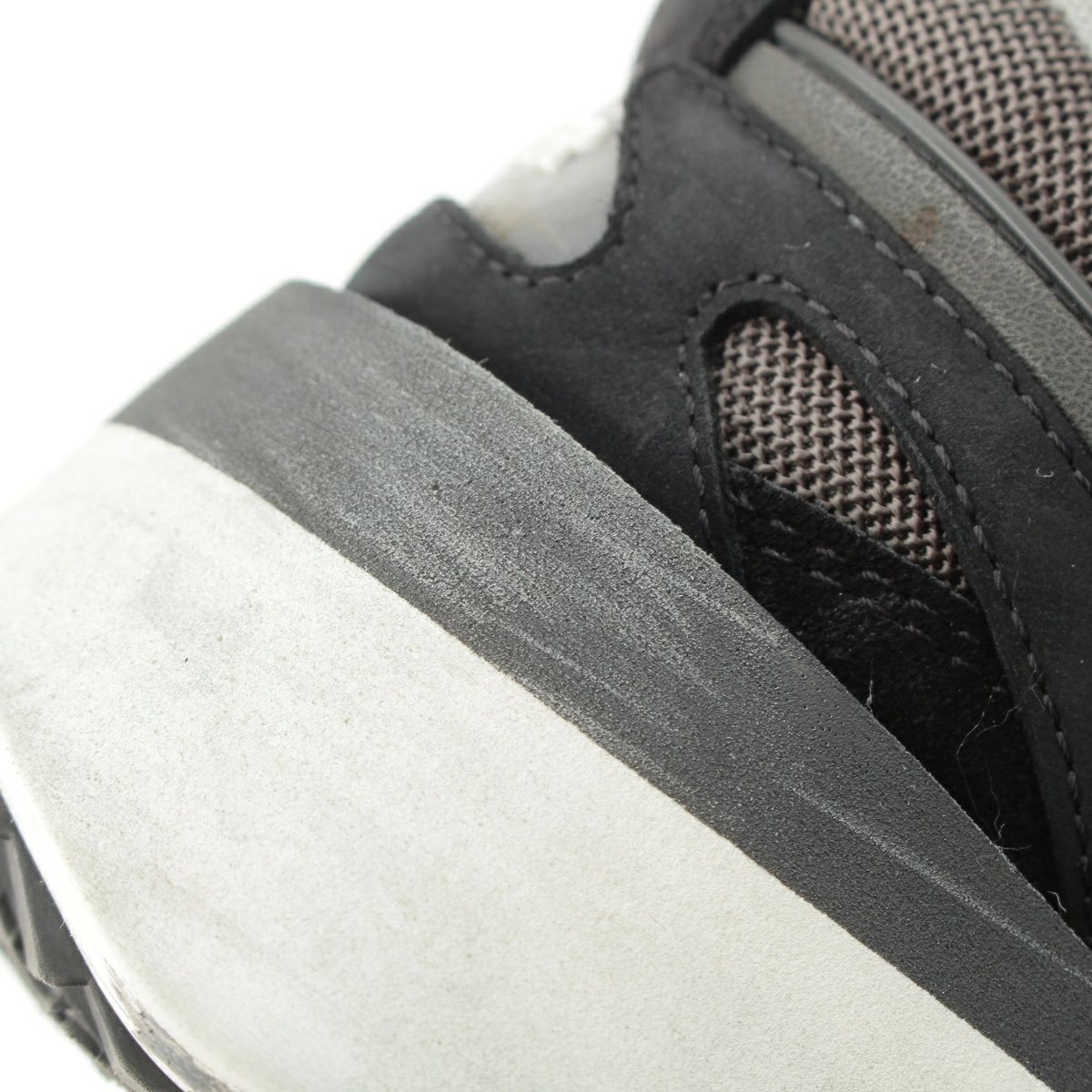 ダメージ箇所: アウトソールに汚れ/擦れ、表面に汚れ/変色/毛羽立ち、保管臭のようなニオイ