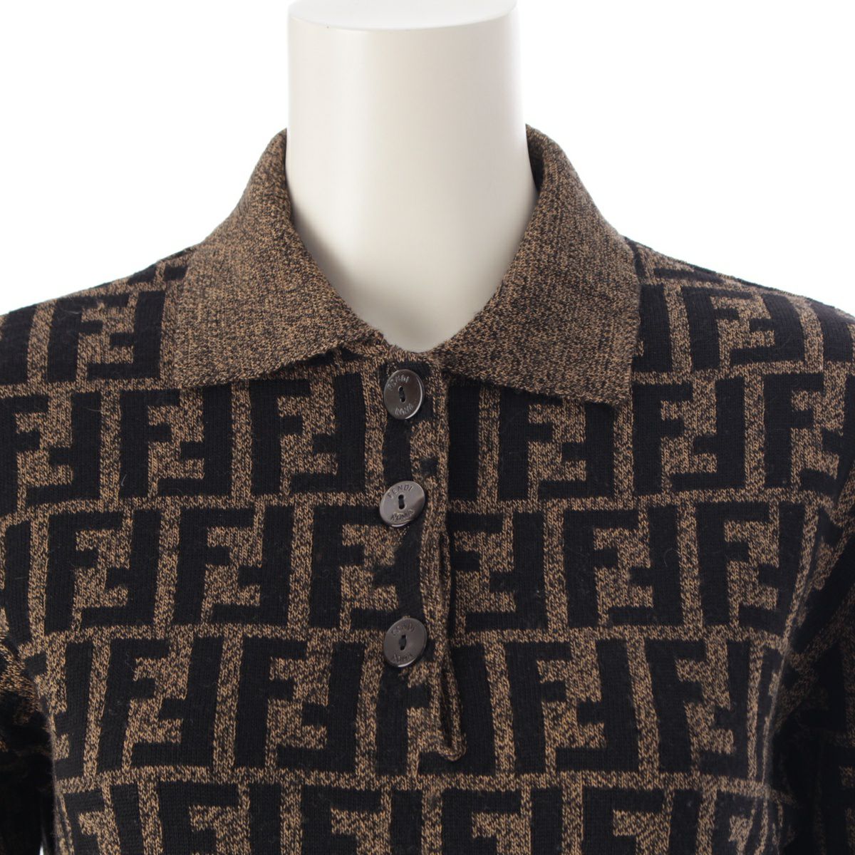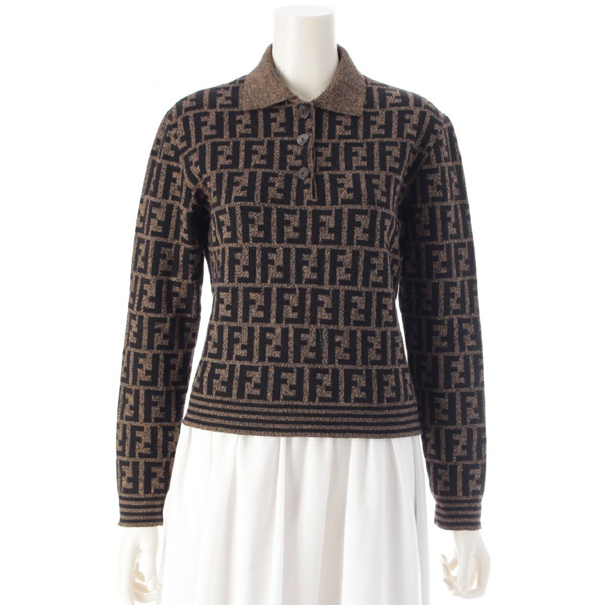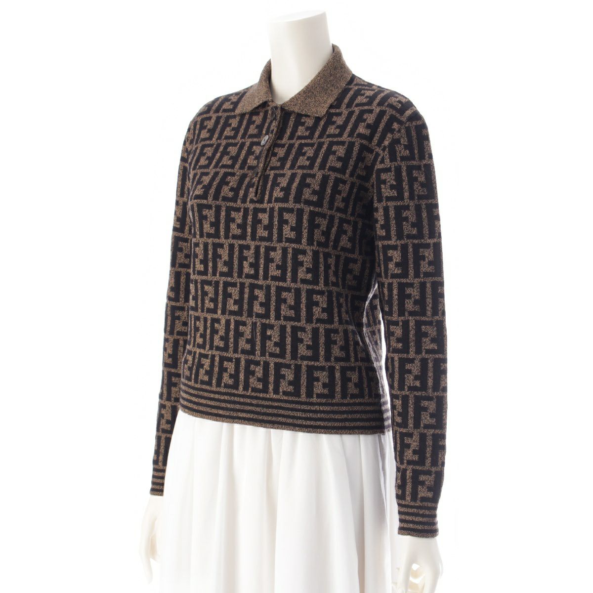 フェンディ メリノウール ズッカ総柄 長袖ニット クロップド ポロシャツ ブラウン ブラック 42