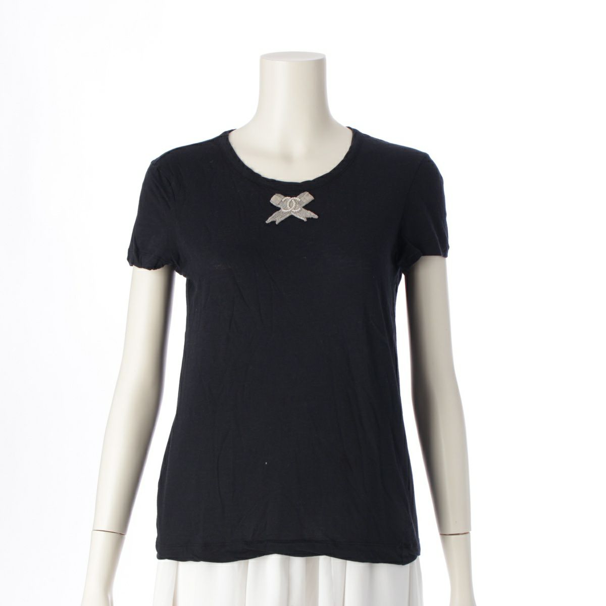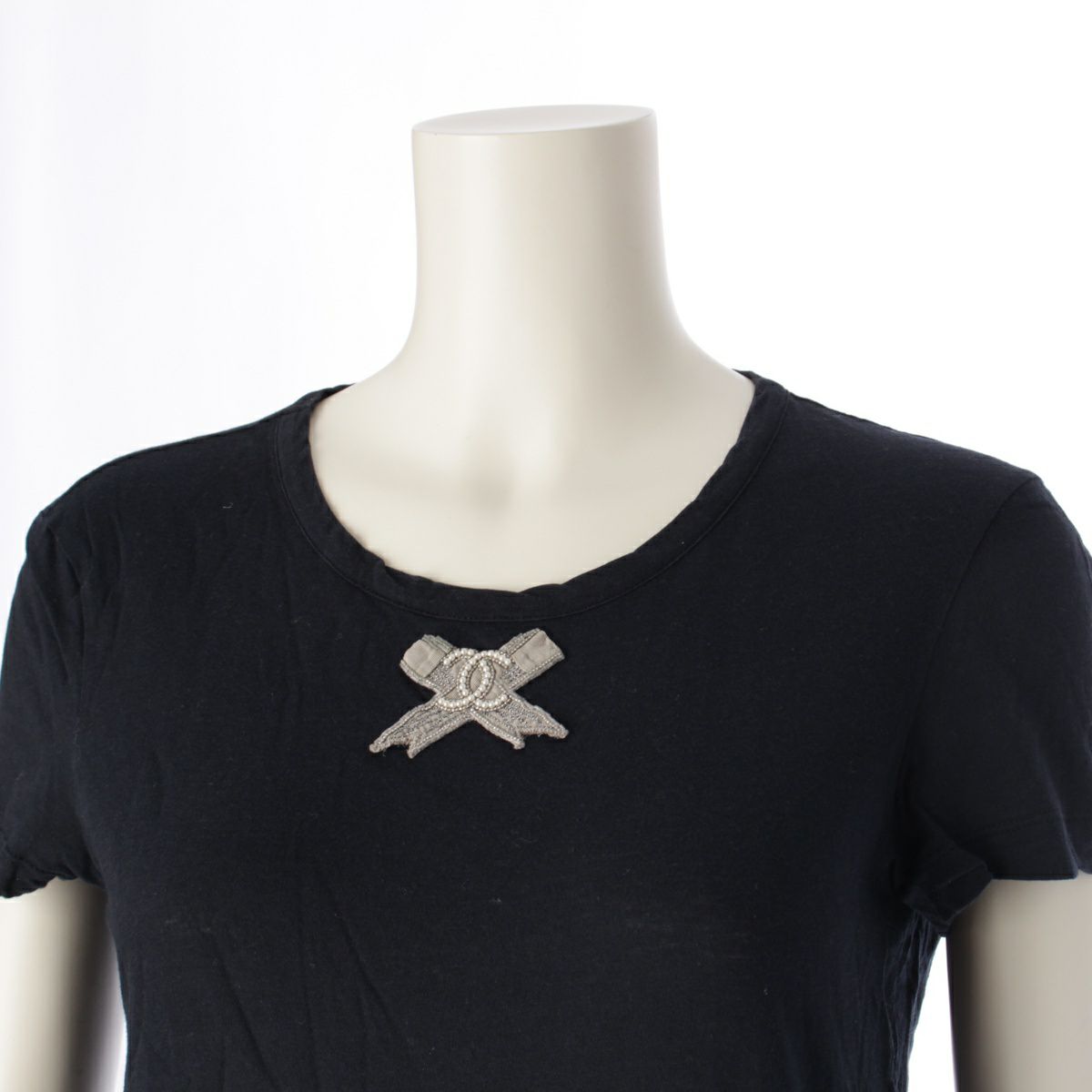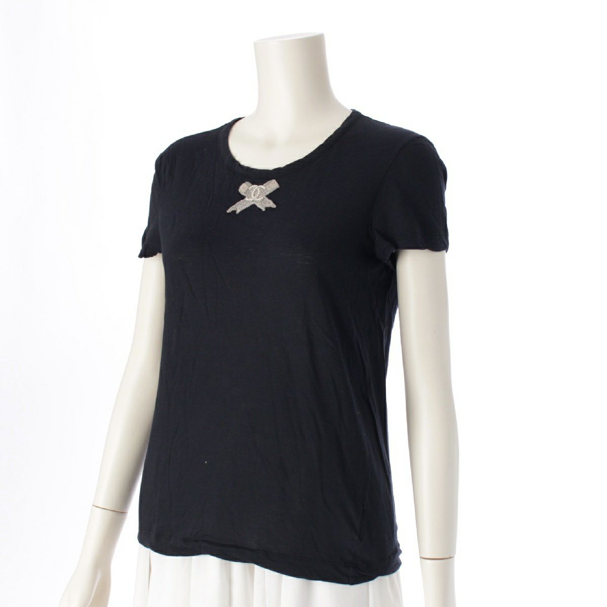 シャネル コットン ココマーク リボンモチーフ クルーネック 半袖Tシャツ トップス カットソー P35187 ブラック 38