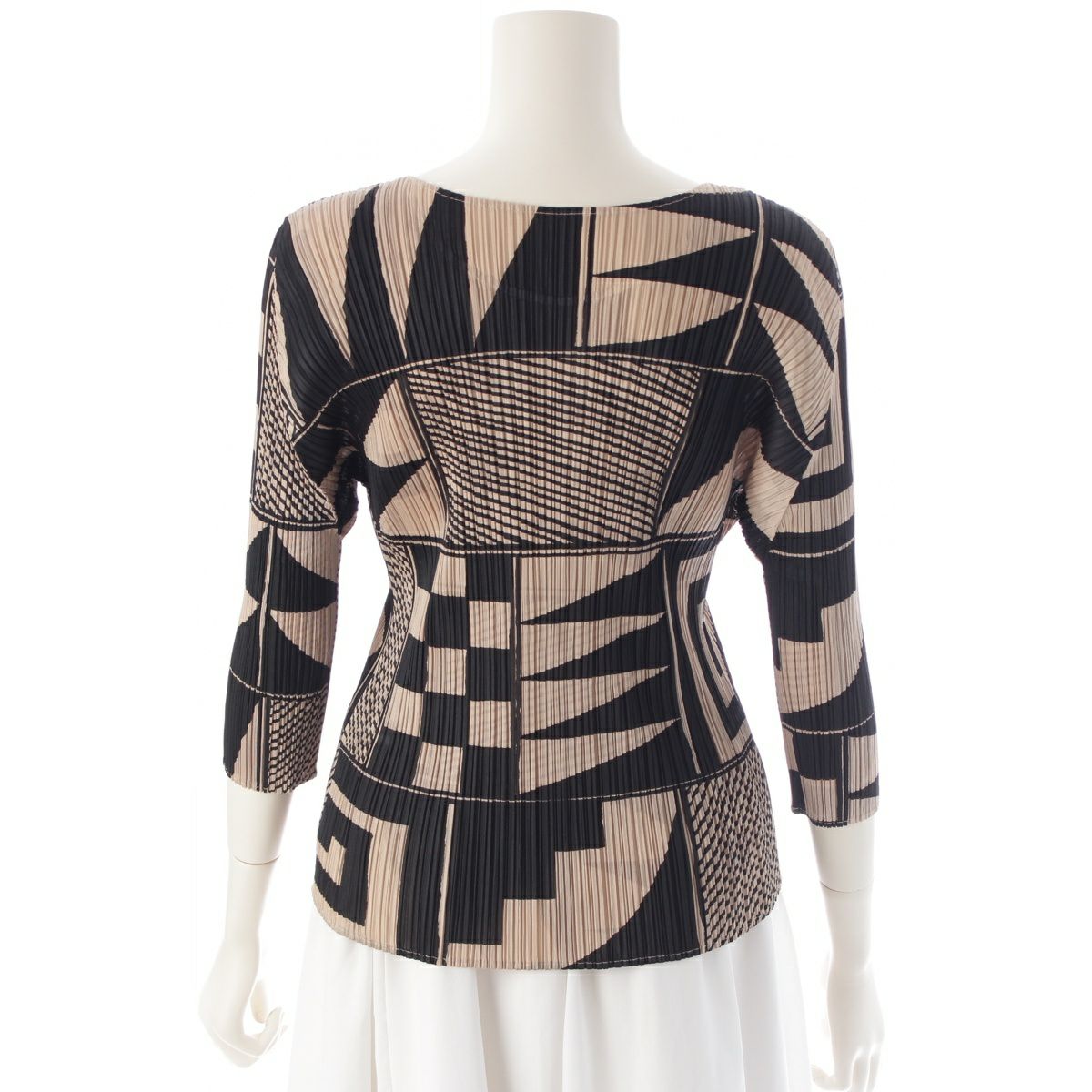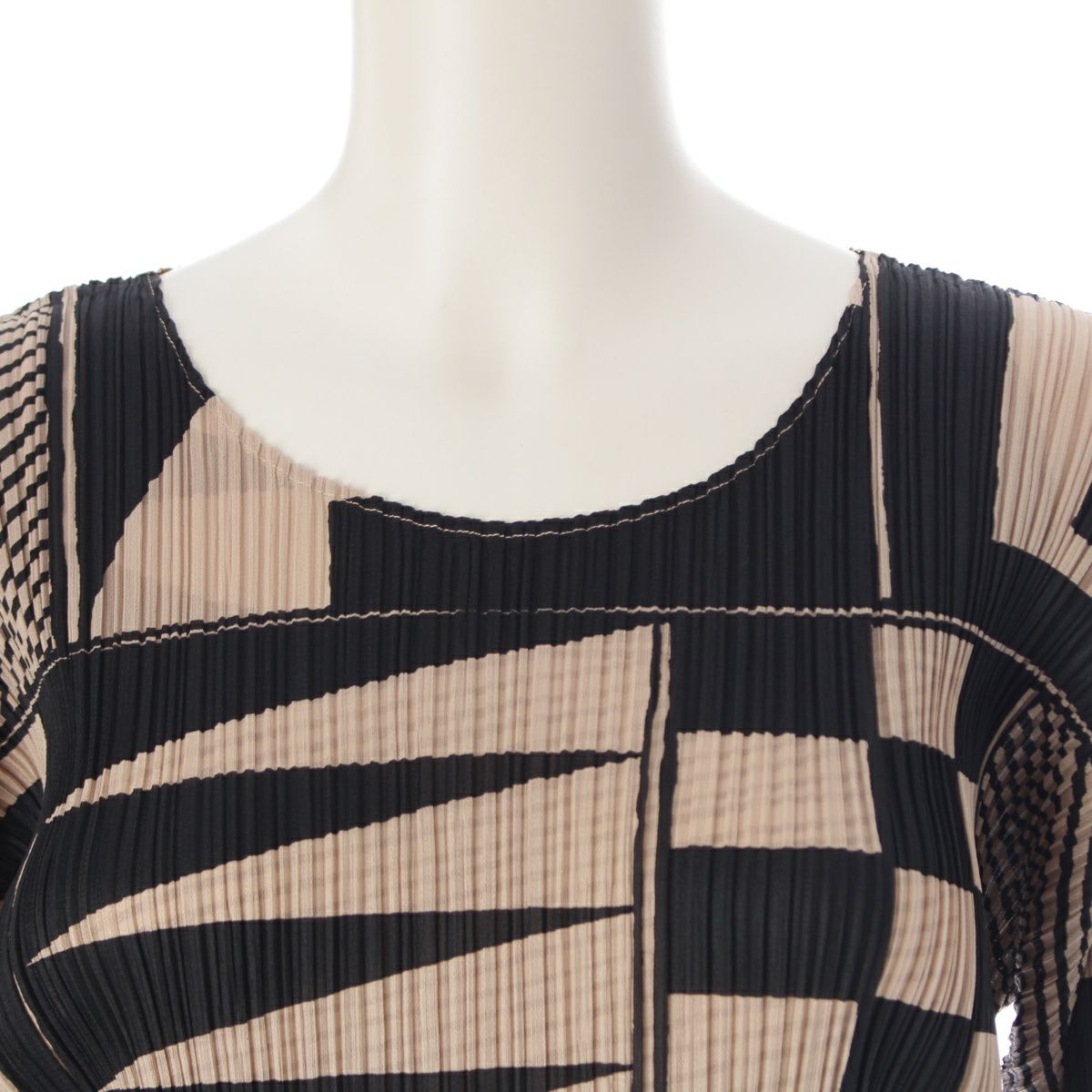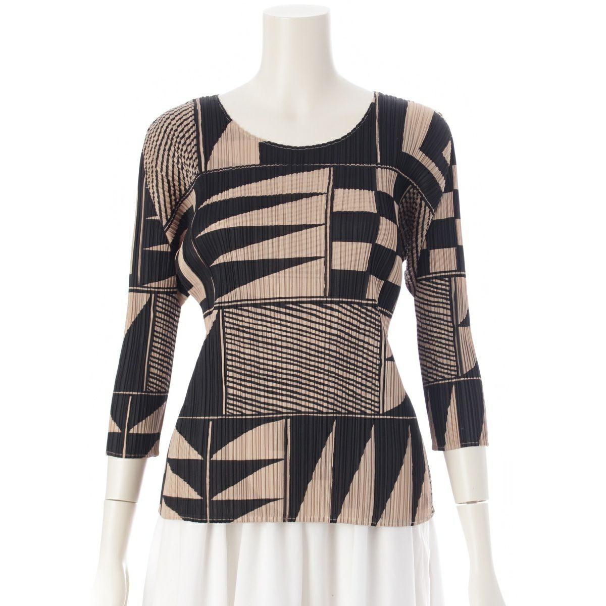 プリーツプリーズ イッセイミヤケ 図形 総柄 7分袖 クルーネック カットソー トップス PP21-JK639 ブラック ベージュ 3