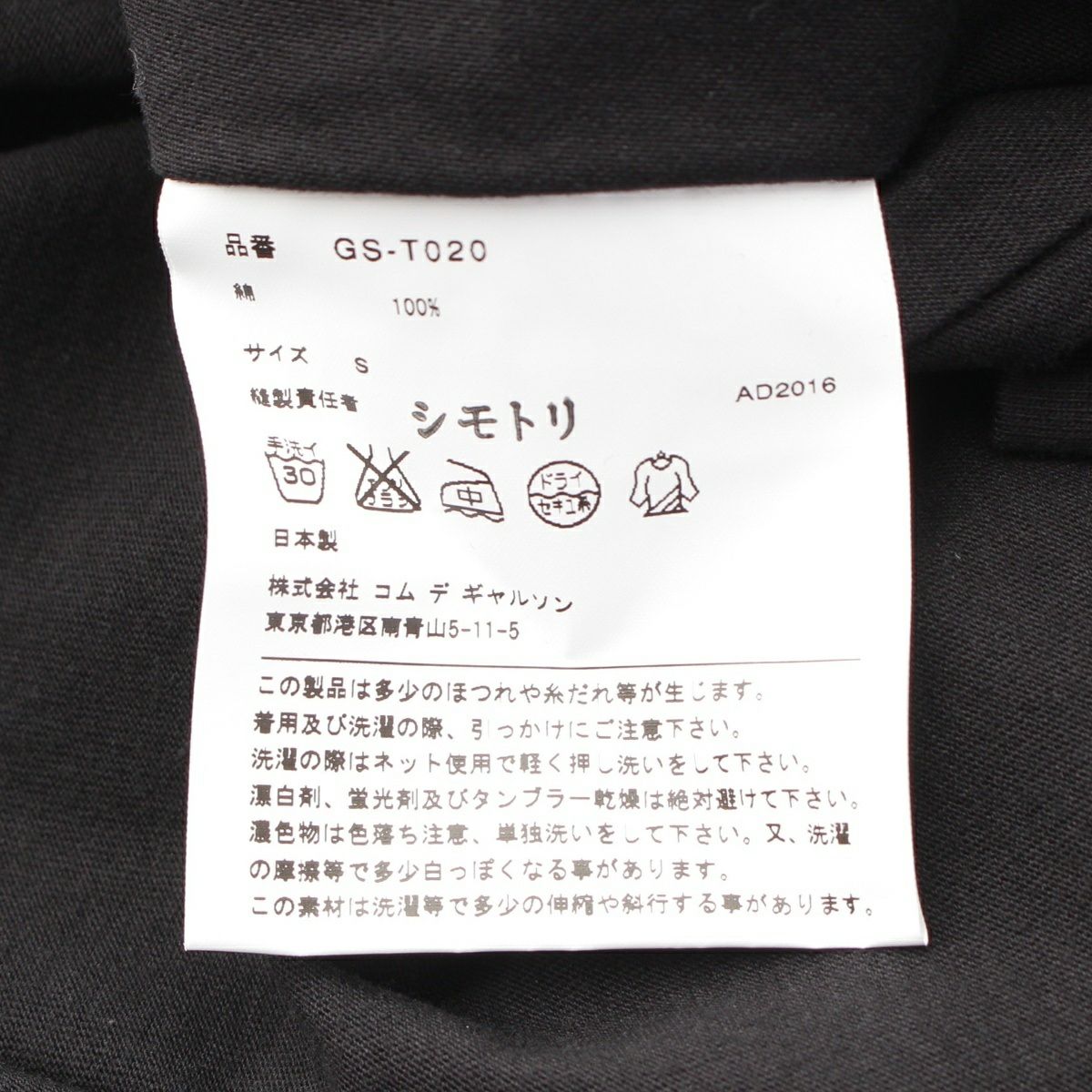 コムデギャルソン AD2016 コットン フラット 多重 デザイン 半袖 カットソー 平面 変形 GS-T020 ブラック S