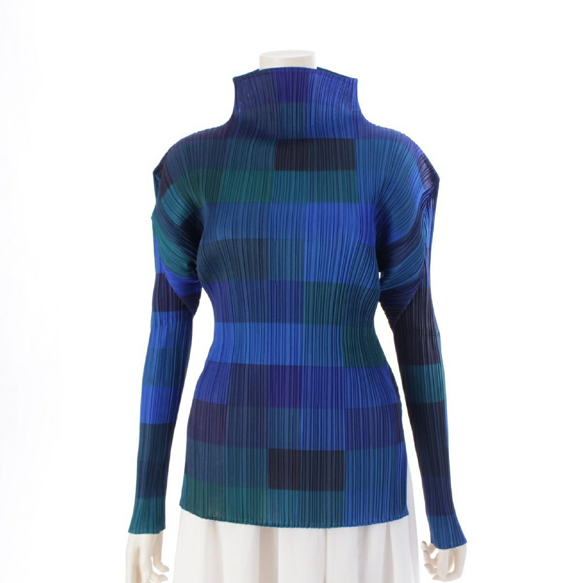 プリーツプリーズ イッセイミヤケ ボトルネック チェック柄 スリット 長袖 トップス カットソー PP83-JK804 ブルー 3