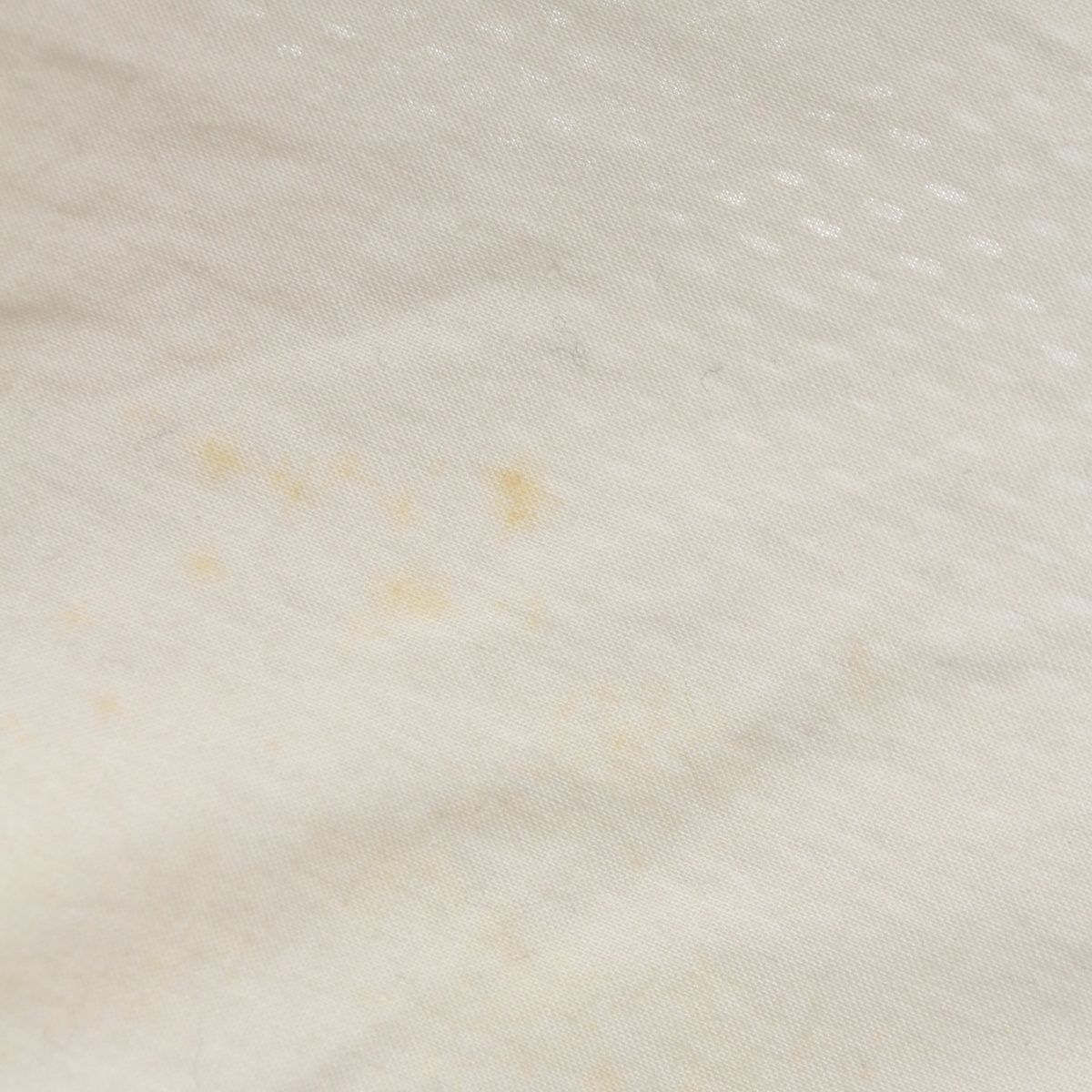 ダメージ箇所: 袖口、背面右下部、裾元、裾元裏等に汚れ、正面左首元裏地に縫製解れ、保管臭のようなニオイ