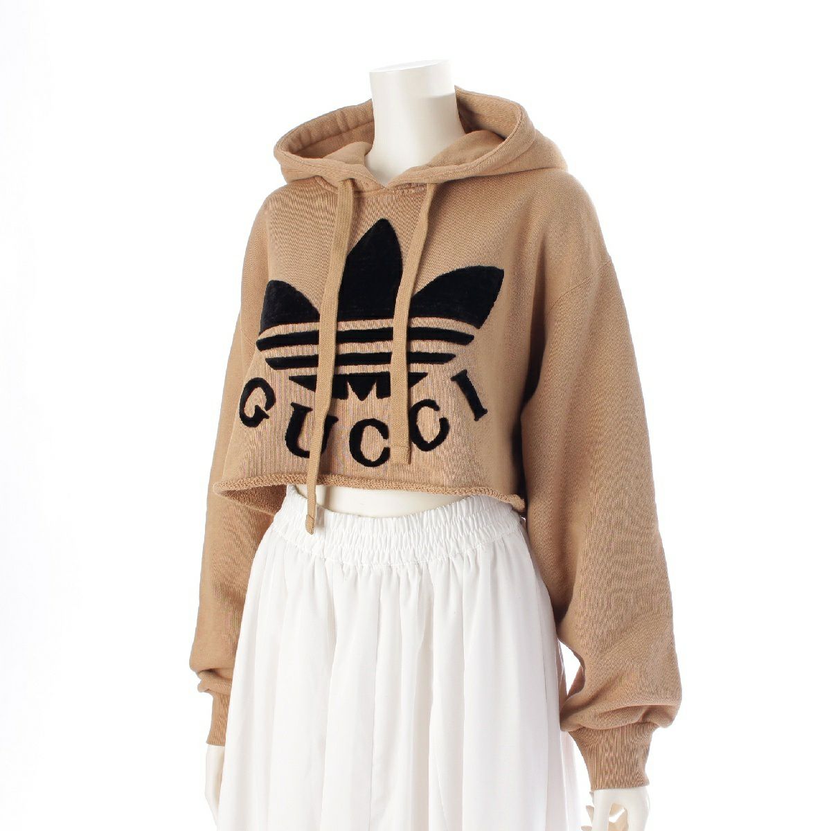 グッチ アディダス コットン ロゴ クロップド フード パーカー フーディー トレーナー トップス ブラウン ブラック XS
