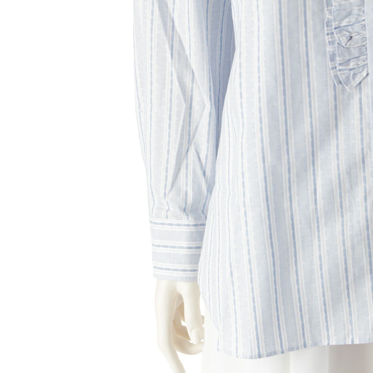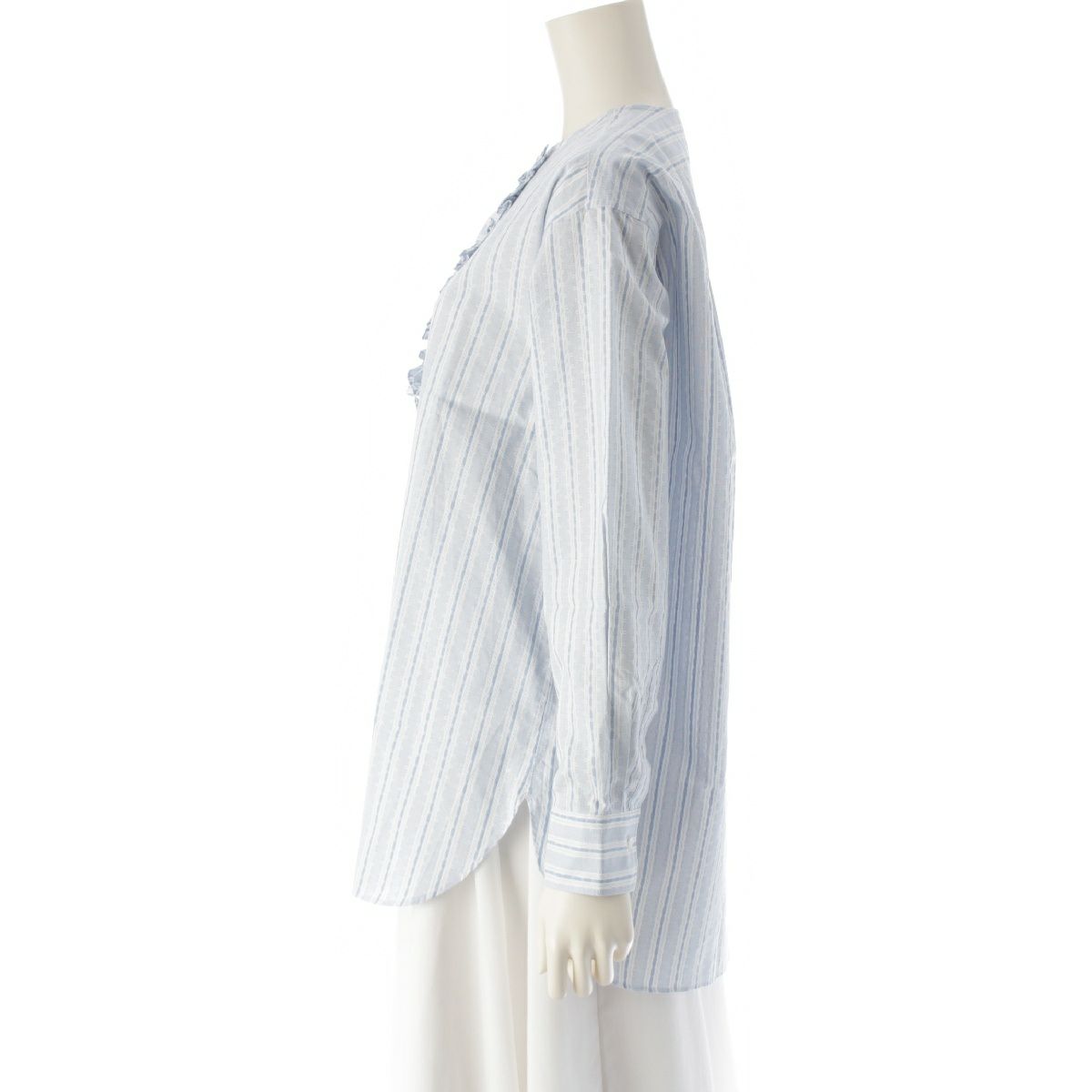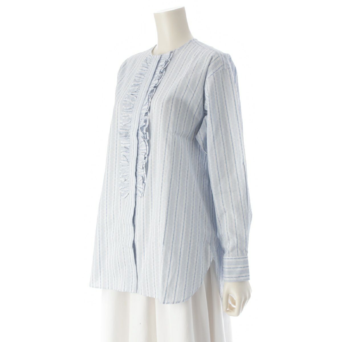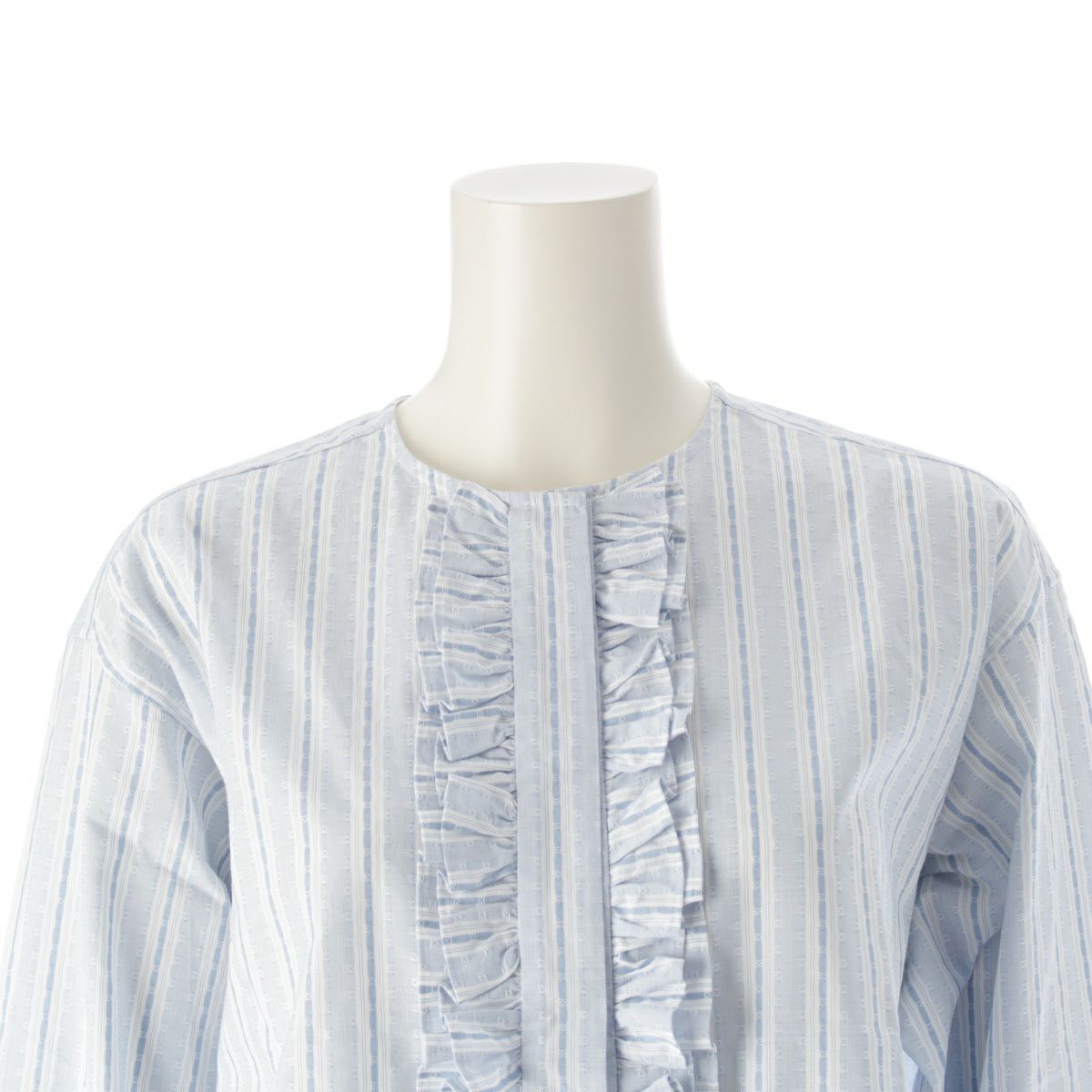 ドゥロワー 22SS コットン ストライプドビー フリル ノーカラー 長袖シャツ ブラウス トップス 6511-218-0478 ホワイト×ブルー 36
