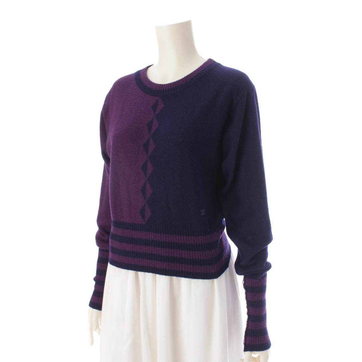 シャネル ヴィンテージ アーガイル クルーネック カシミヤ ニット セーター パープル×ネイビー