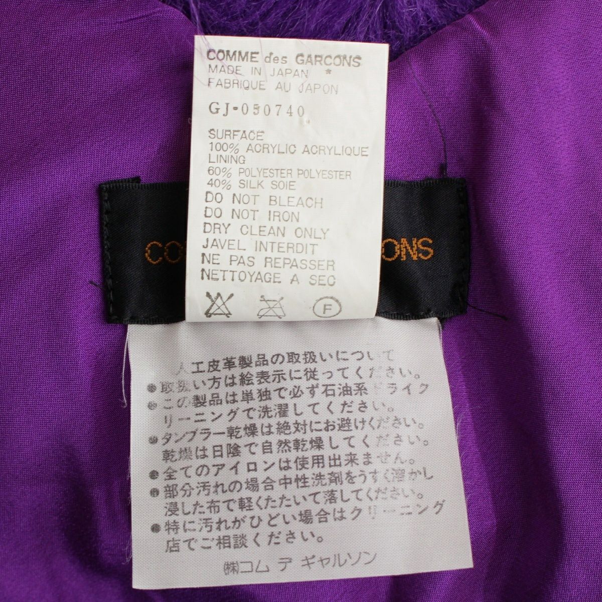 コムデギャルソン AD1989 アクリル ファー 変形 ジャケット ストール ベスト GJ-050740 パープル