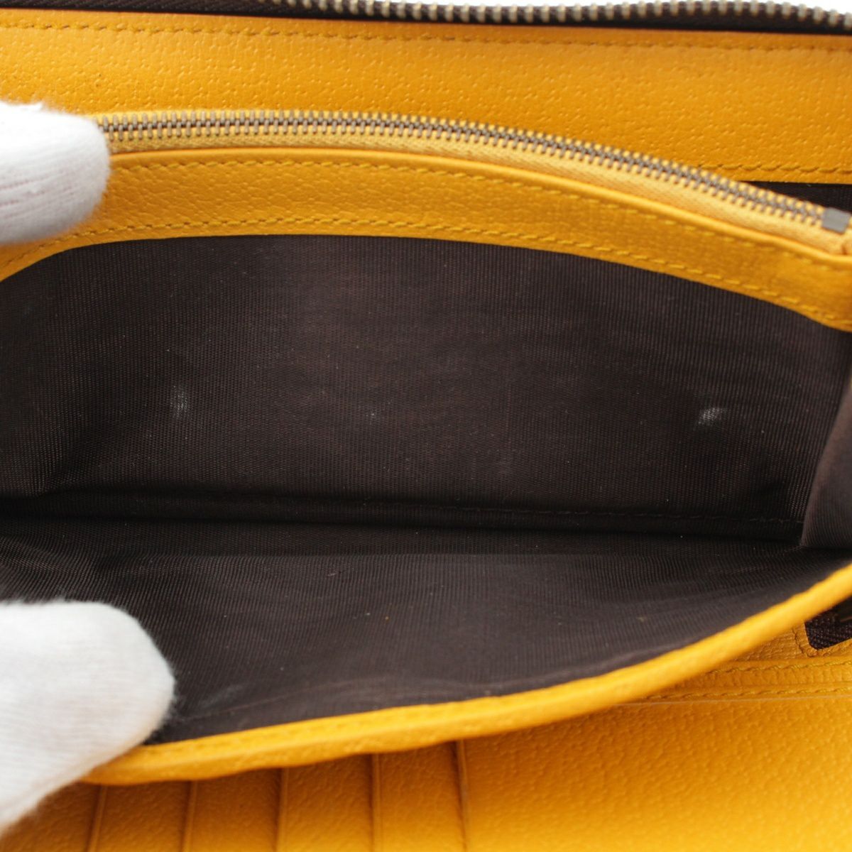 ダメージ箇所: カードポケット・オープンポケットに汚れ/擦れ、ファスナーに汚れ/変色/擦れ/傷、ファスナーストラップに、内側レザーに汚れ/擦れ/傷/緑青、ロゴ・金具に変色/劣化、保管臭のようなニオイ